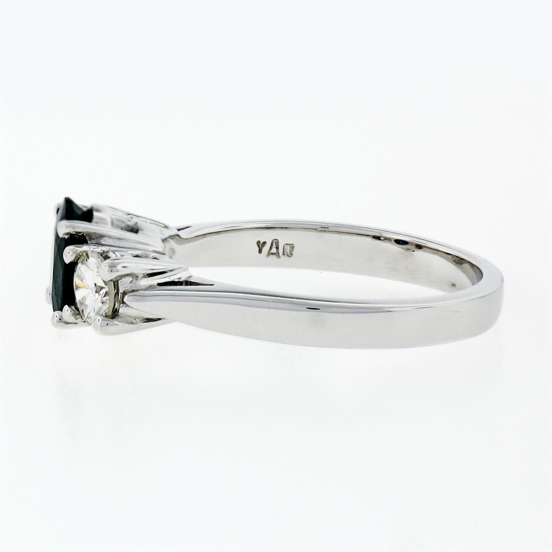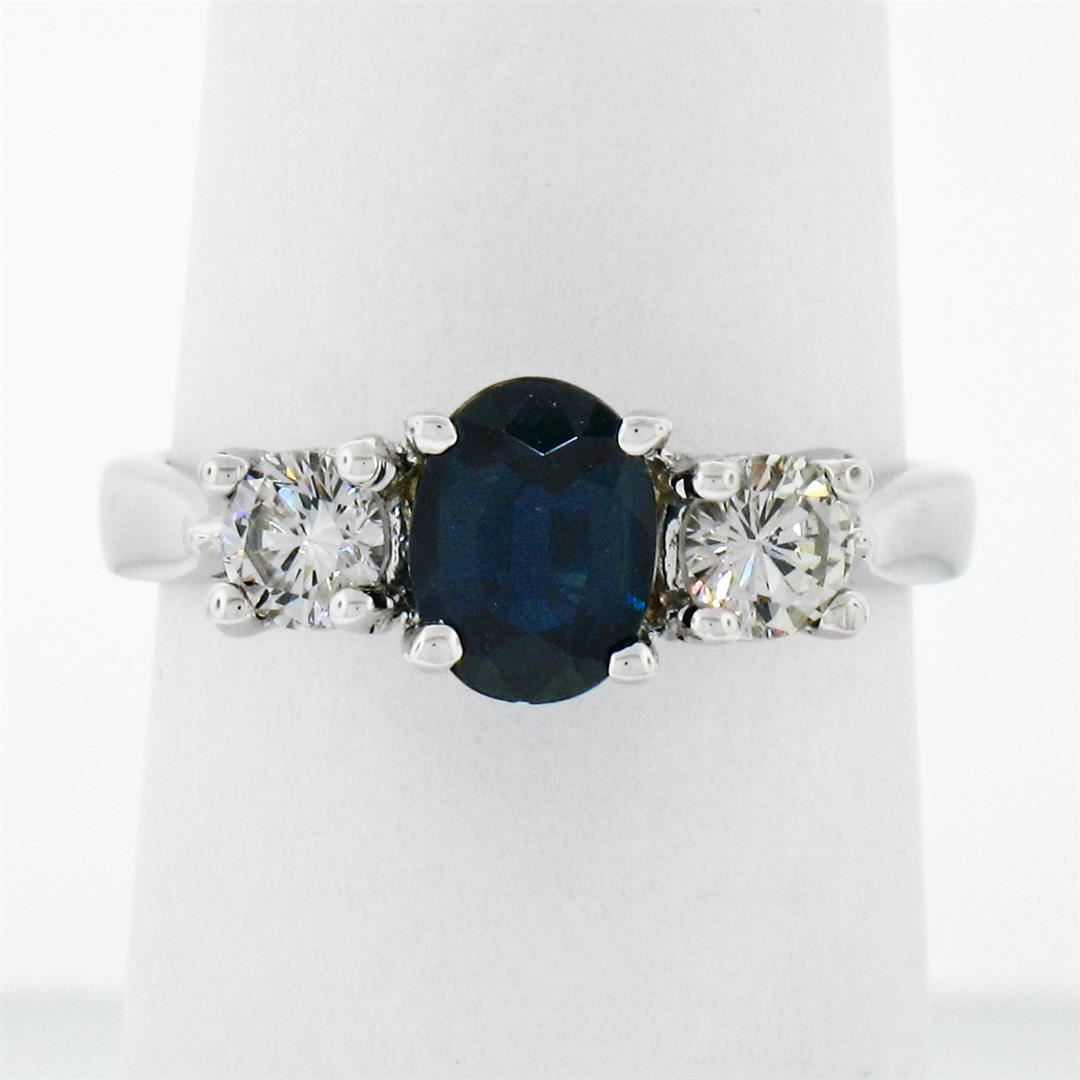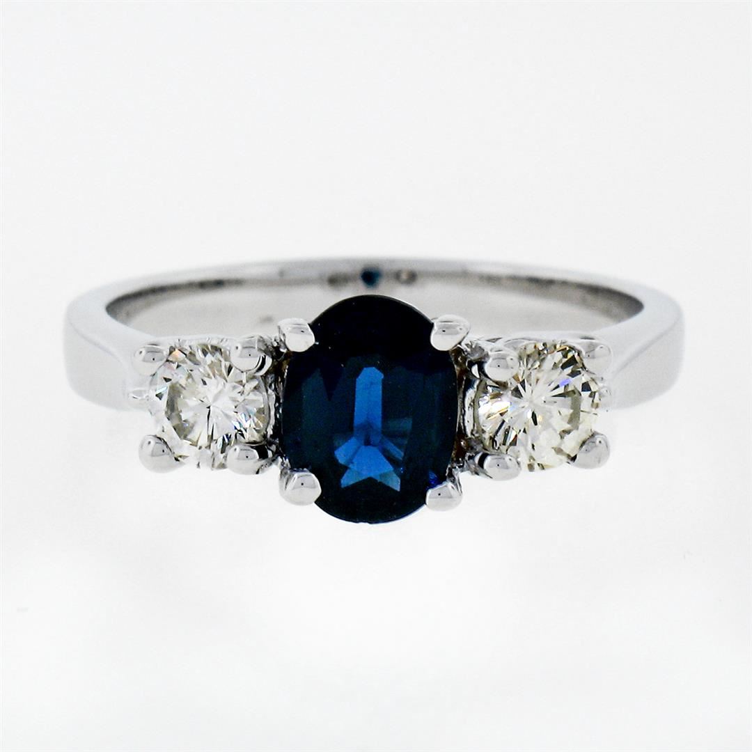A new solid 14k white gold 3 stones ring, with 1 oval cut natural sapphire (7.0x5.30mm - 1.03ct), and 2 round brilliant cut natural diamonds (F/G- VS2 ; 0.50ctw ). The ring is size 6.5, weighs a total of 3.86 grams, and measures 7.0mm wide.