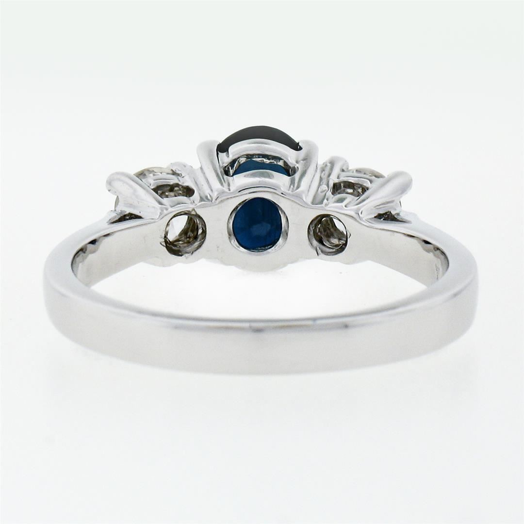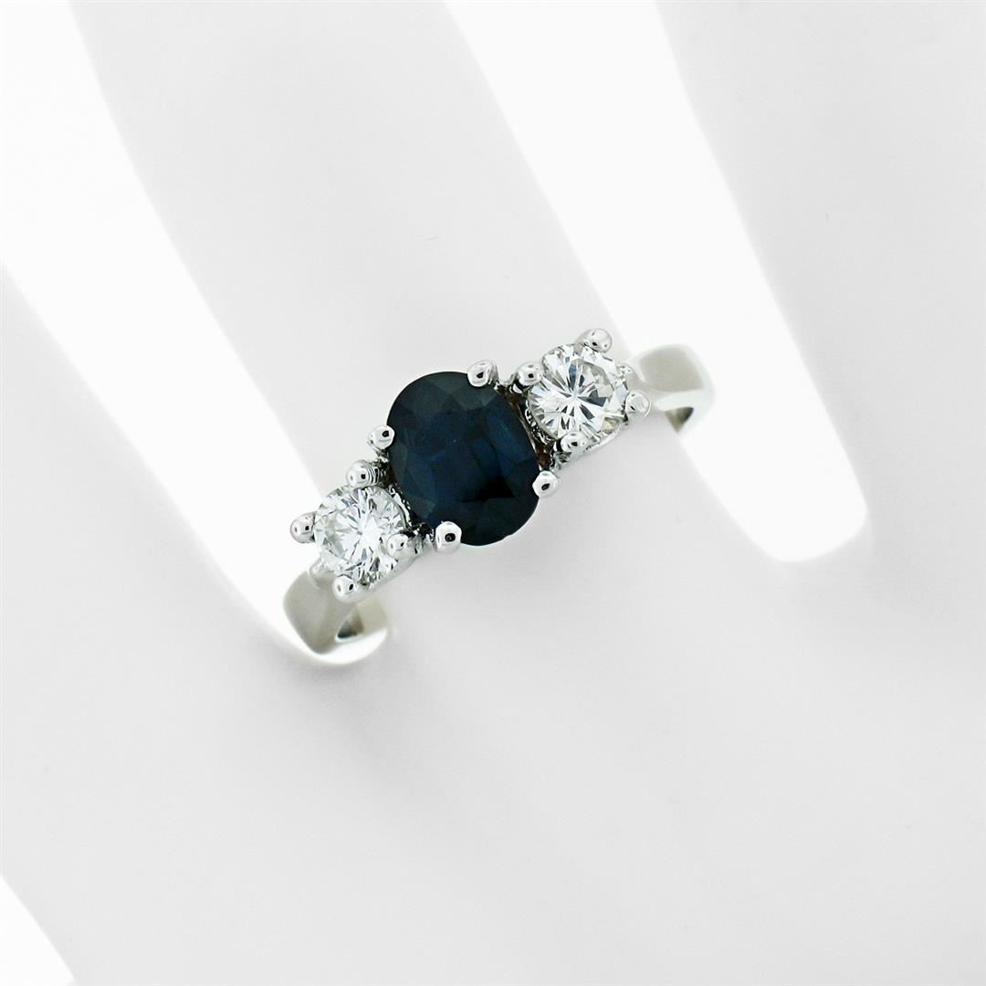 A new solid 14k white gold 3 stones ring, with 1 oval cut natural sapphire (7.0x5.30mm - 1.03ct), and 2 round brilliant cut natural diamonds (F/G- VS2 ; 0.50ctw ). The ring is size 6.5, weighs a total of 3.86 grams, and measures 7.0mm wide.