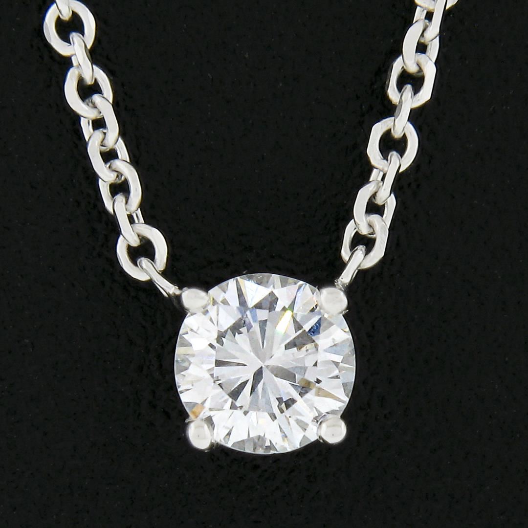 A new solid 14k white gold solitaire pendant necklace, with 1 round cut natural diamond (H - VS1/VS2 ; 0.33ct). Adjustable at 16 or 18 inch cable link chain, 2.38 grams total weight, pendant measures 5.4mm.