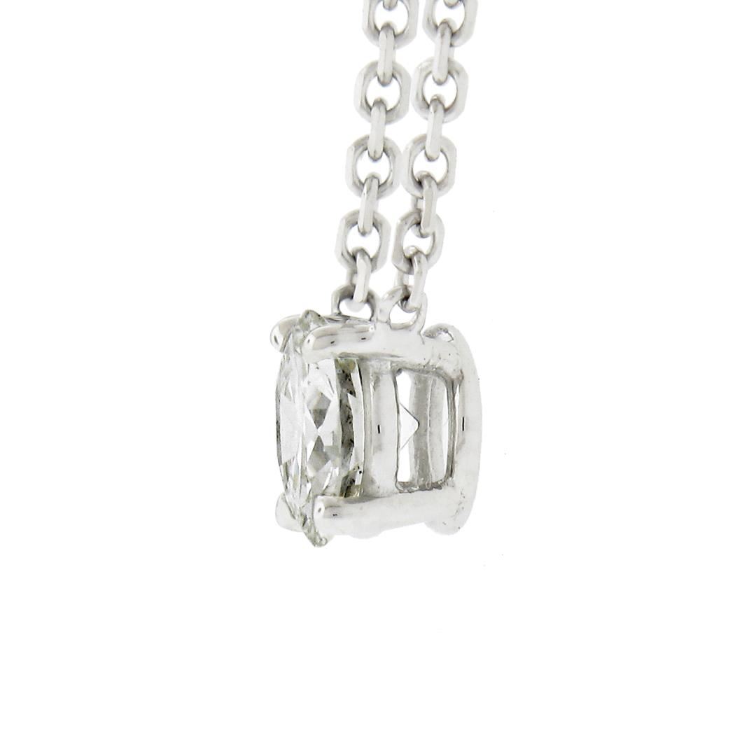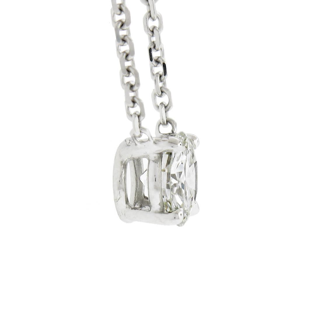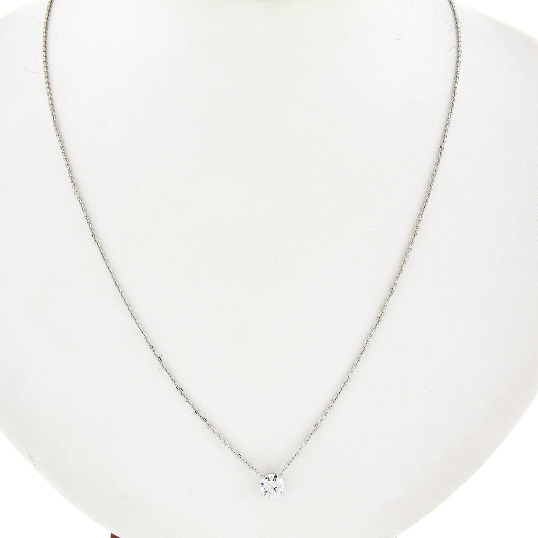 A new solid 14k white gold solitaire pendant necklace, with 1 round cut natural diamond (i, VS2 ; 0.42ct). Adjustable 16 or 18 inch cable link chain, 2.32 grams total weight, pendant measures 5.1mm in diameter.