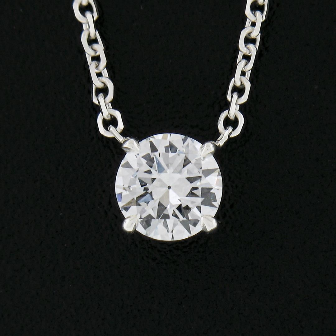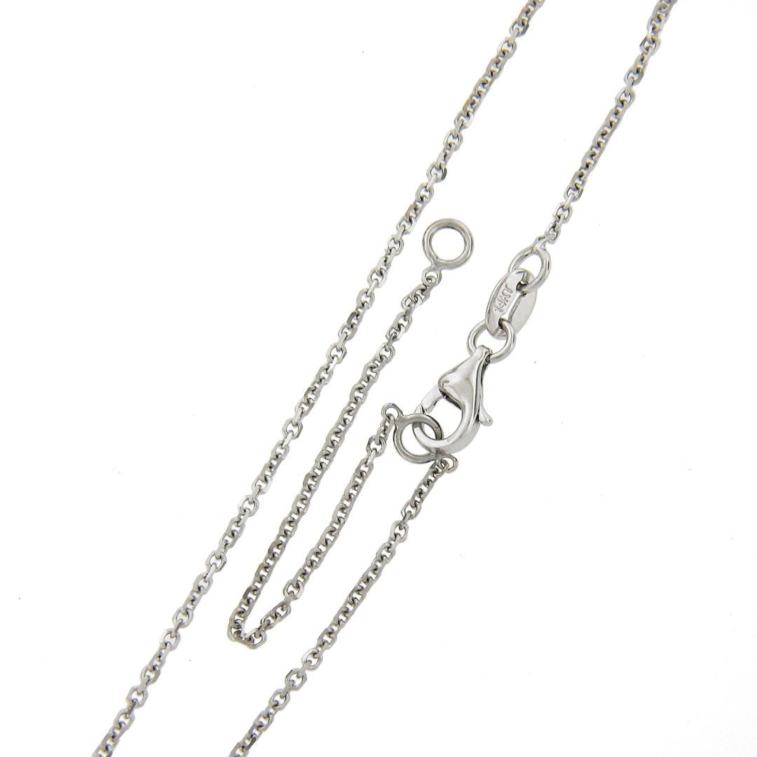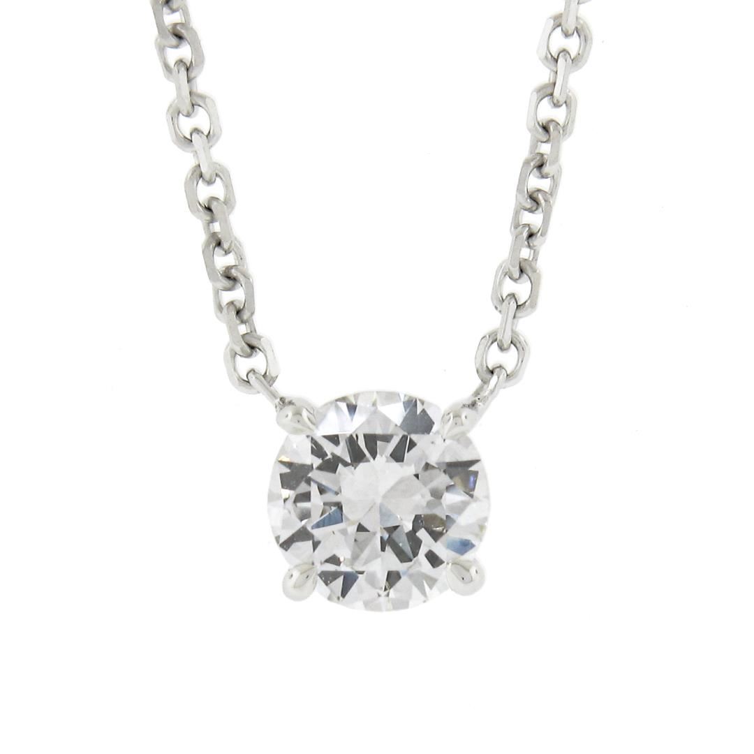 A new solid 14k white gold solitaire pendant necklace, with 1 round cut natural diamond (i, VS2 ; 0.42ct). Adjustable 16 or 18 inch cable link chain, 2.32 grams total weight, pendant measures 5.1mm in diameter.