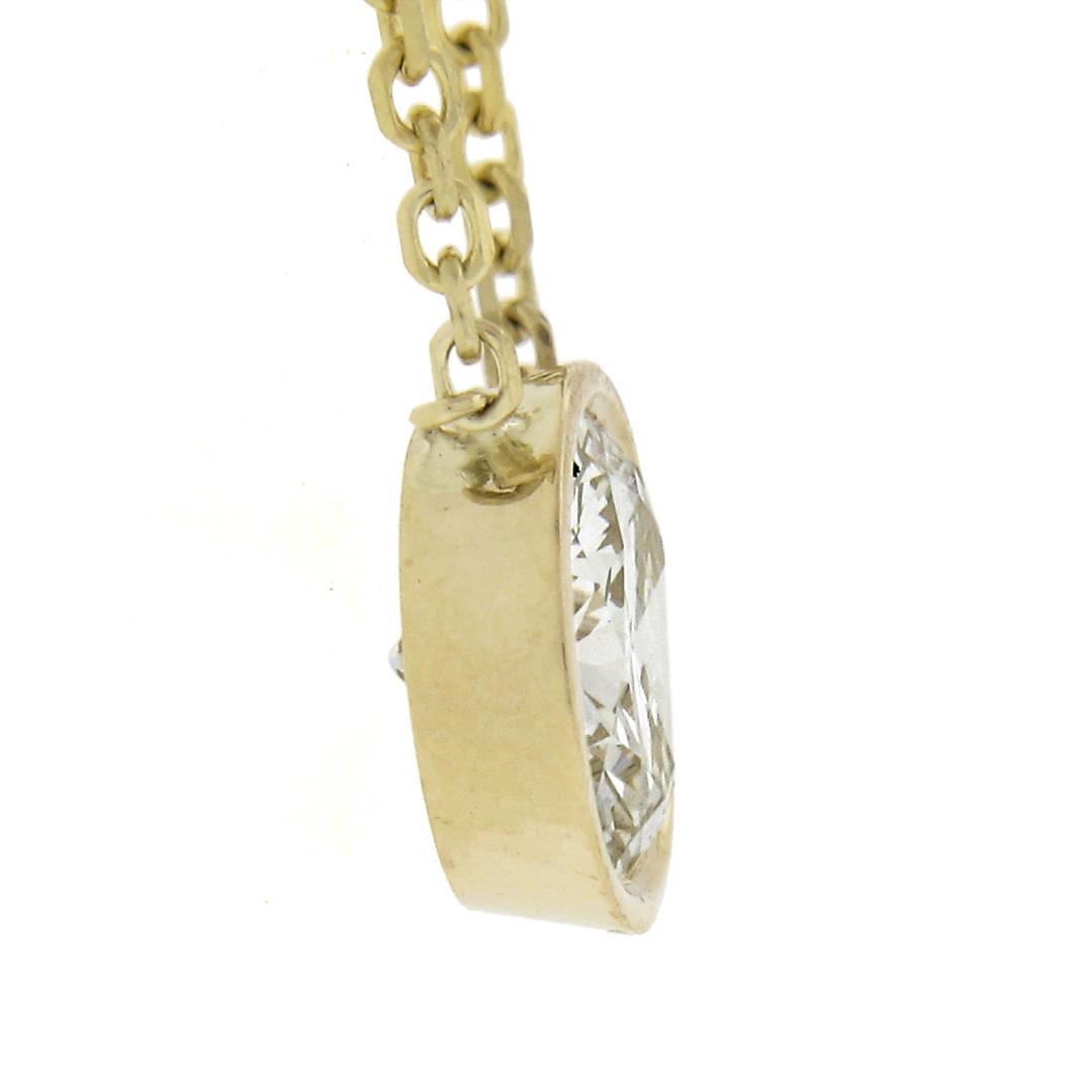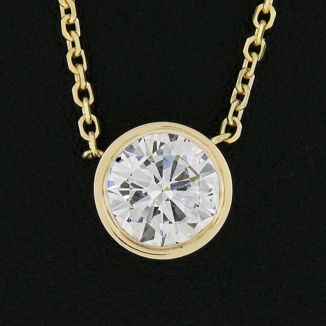 A new solid 14k yellow gold solitaire pendant necklace, with 1 round cut natural diamond (I - VS2 ; 0.67ct). Adjustable at 16, 17 or 18 inch cable link chain, 2.15 grams total weight, pendant measures 6.9mm.
