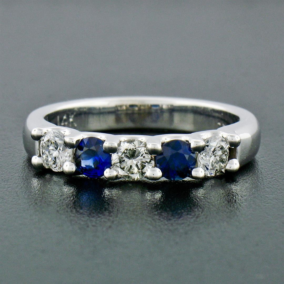 A new solid 14k white gold band ring, featuring 2 round brilliant cut natural sapphires (0.38ctw), alternated with 3 round brilliant cut natural diamonds (G - VS2 ; 0.51ctw). The ring is size 6.0, weighs a total of 3.71 grams, and measures 3.7mm wide.