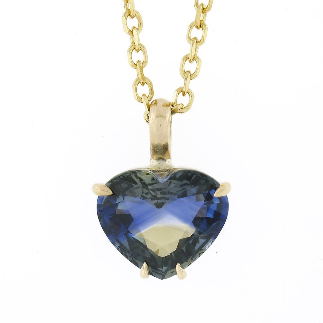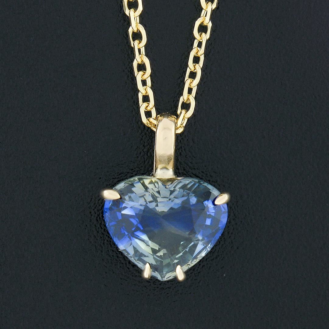 A new solid 14k yellow gold pendant necklace, with 1 Gia certified heart cut natural sapphire (2.82ct). 18 inch cable link chain, 3.85 grams total weight, pendant measures 12.8x10mm. Comes with all original relevant certifications.