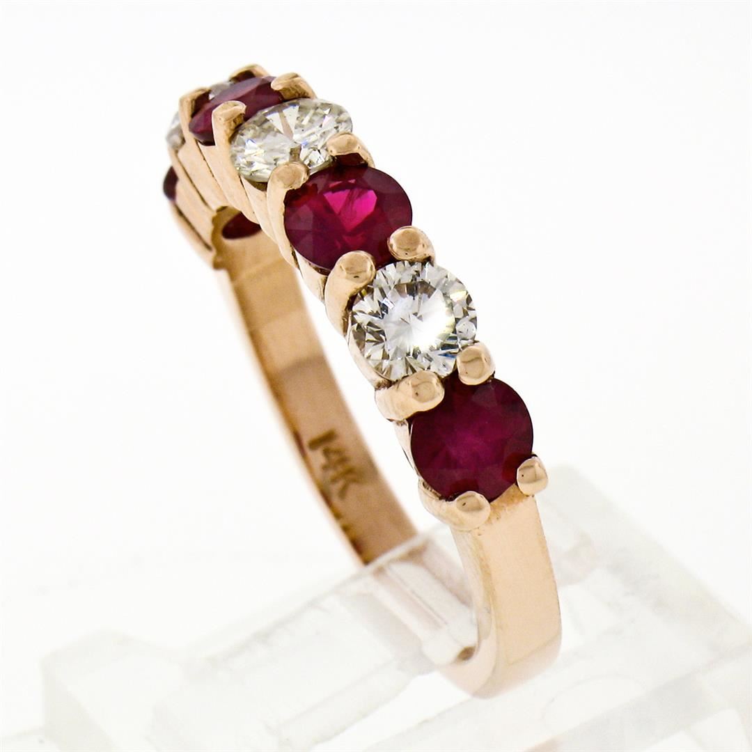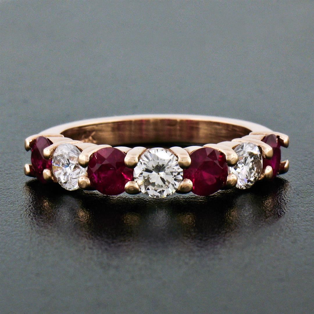 A new solid 14k rose gold band ring, with 4 round brilliant cut natural rubies (1.43ctw), alternated with 5 round brilliant cut natural diamonds (F/G- VS2; 0.86ctw). The ring is size 7.0, weighs a total of 4.45 grams, and measures 4.25mm wide.
