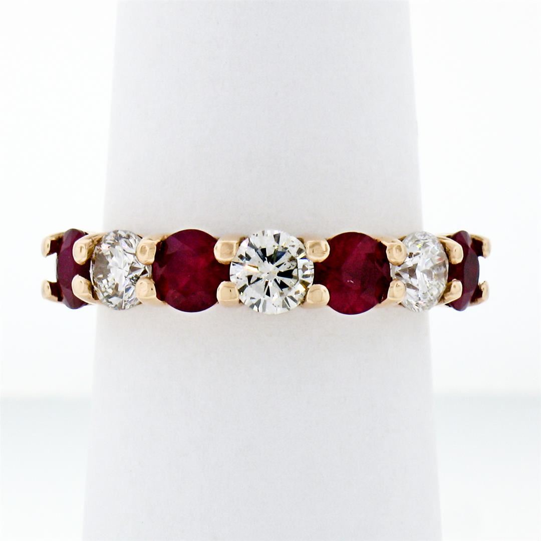 A new solid 14k rose gold band ring, with 4 round brilliant cut natural rubies (1.43ctw), alternated with 5 round brilliant cut natural diamonds (F/G- VS2; 0.86ctw). The ring is size 7.0, weighs a total of 4.45 grams, and measures 4.25mm wide.