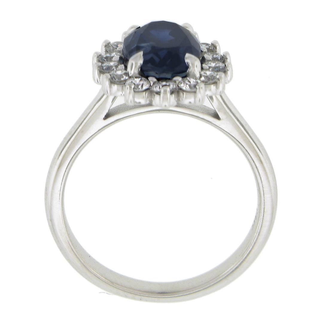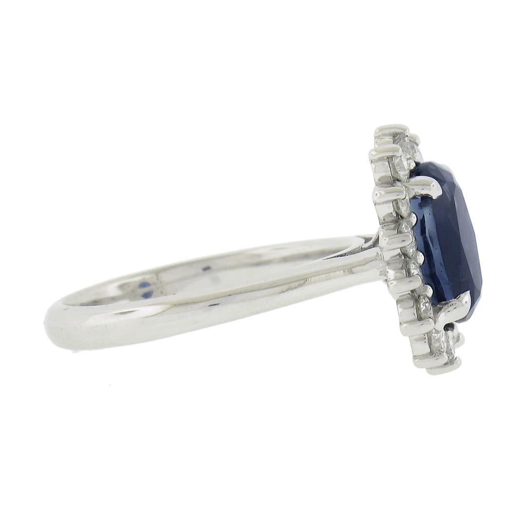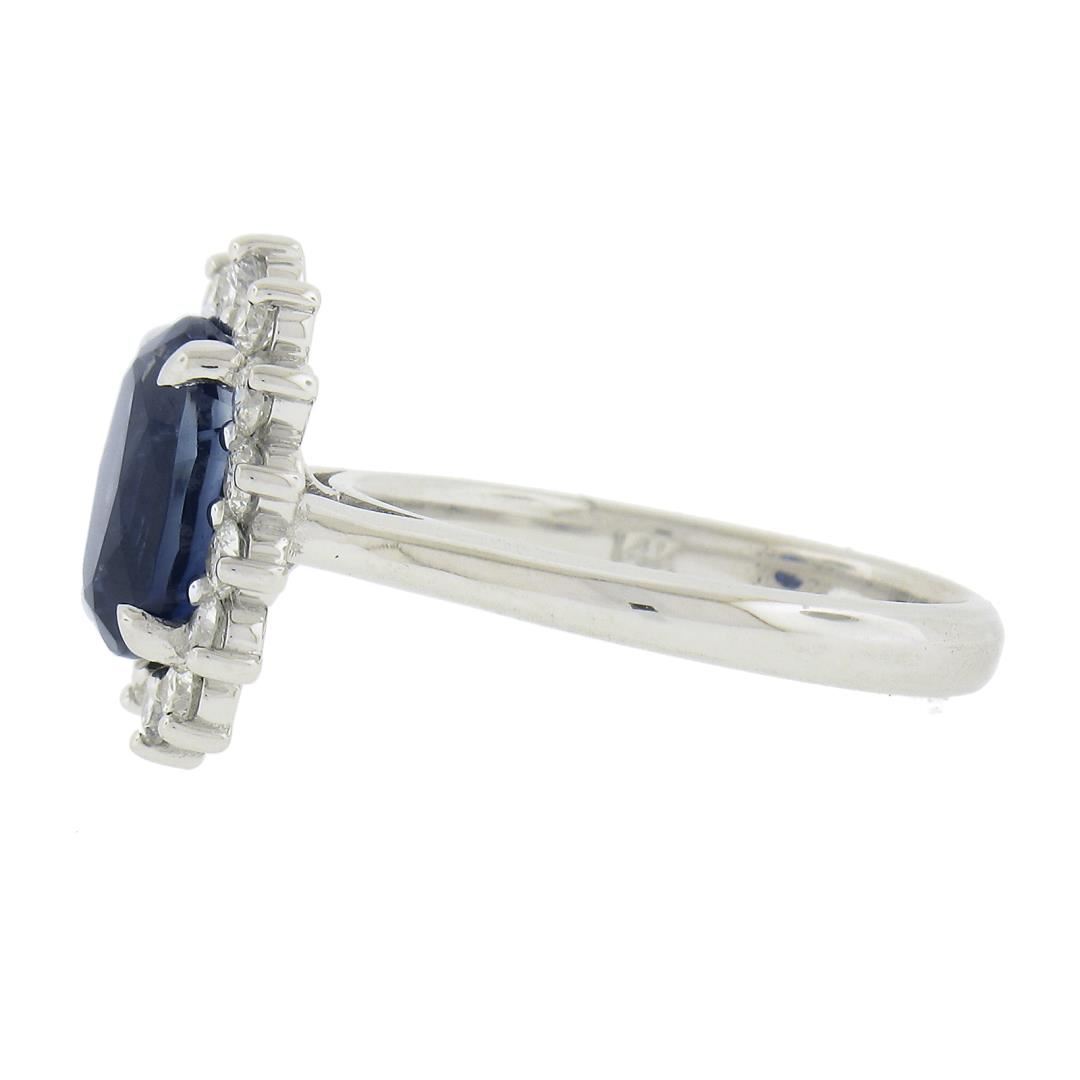 A solid new 14k white gold ring, with 1 GIA graded oval cut natural sapphire (2.97ct ), surrounded with a halo of 14 round cut natural diamonds (E/F Color - VS1/VS2 ; 0.55ctw). The ring is size 6.5, weighs a total of 4.52 grams, and measures 14.7mm wide. Comes with all original relevant certifications.
