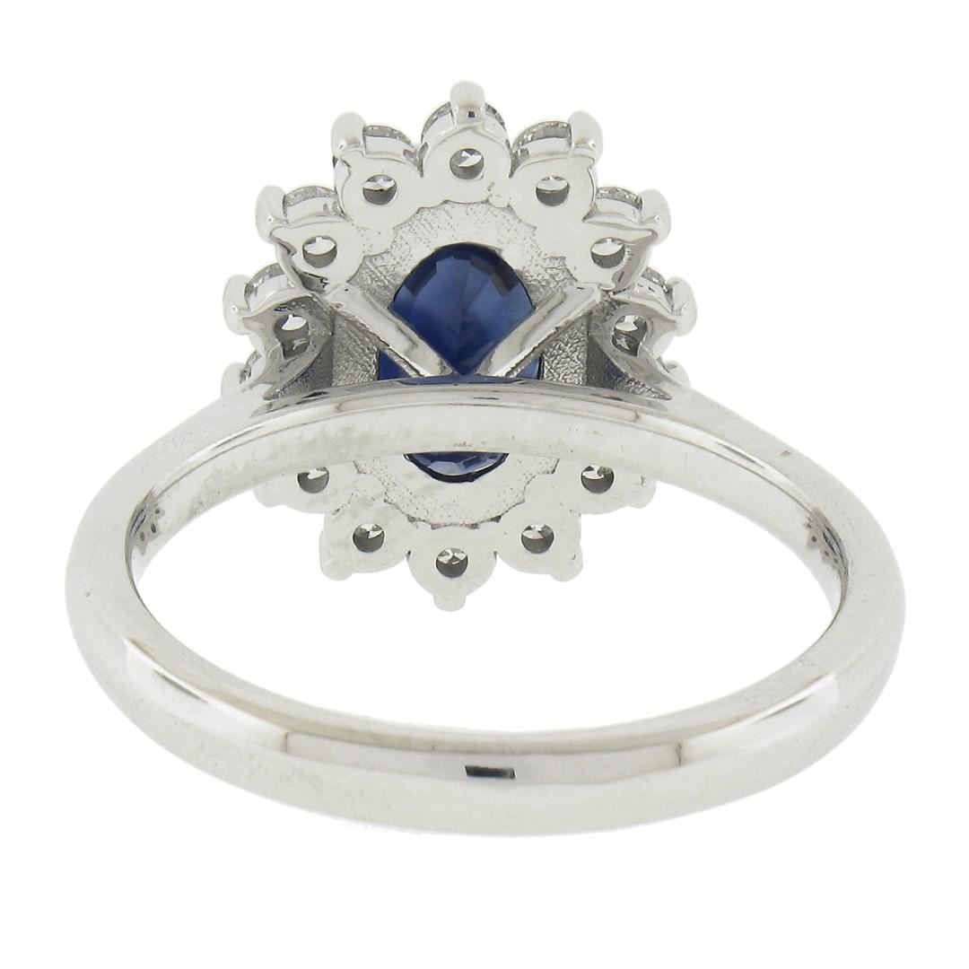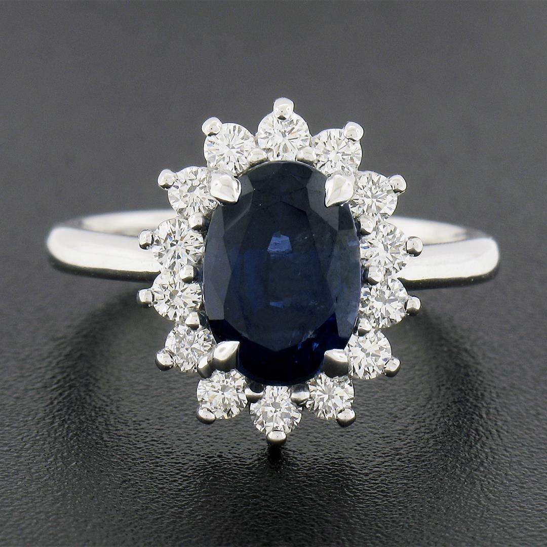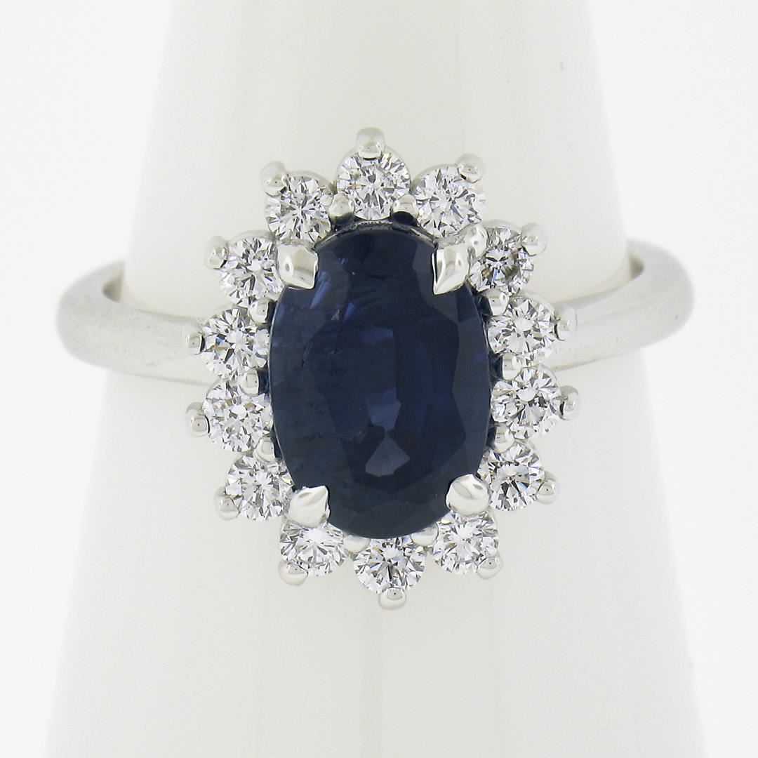 A solid new 14k white gold ring, with 1 GIA graded oval cut natural sapphire (2.97ct ), surrounded with a halo of 14 round cut natural diamonds (E/F Color - VS1/VS2 ; 0.55ctw). The ring is size 6.5, weighs a total of 4.52 grams, and measures 14.7mm wide. Comes with all original relevant certifications.