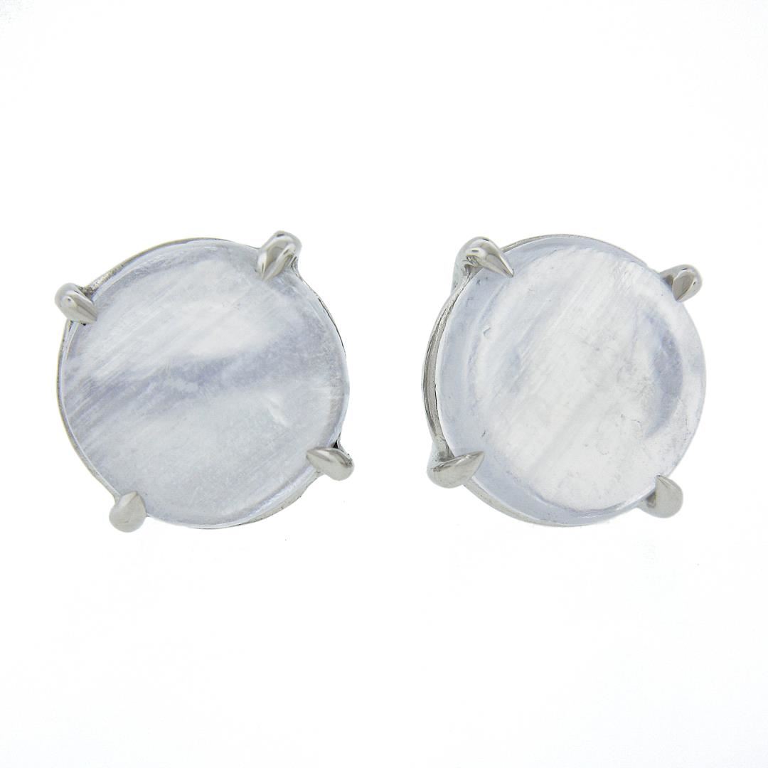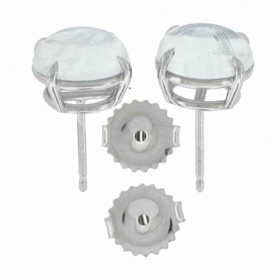 A new solid 14k white gold stud earrings, with 2 round cabochon cut natural moonstones (8.7mm). The earrings measure approximately 10.1mm and weigh a total of 2.34 grams.