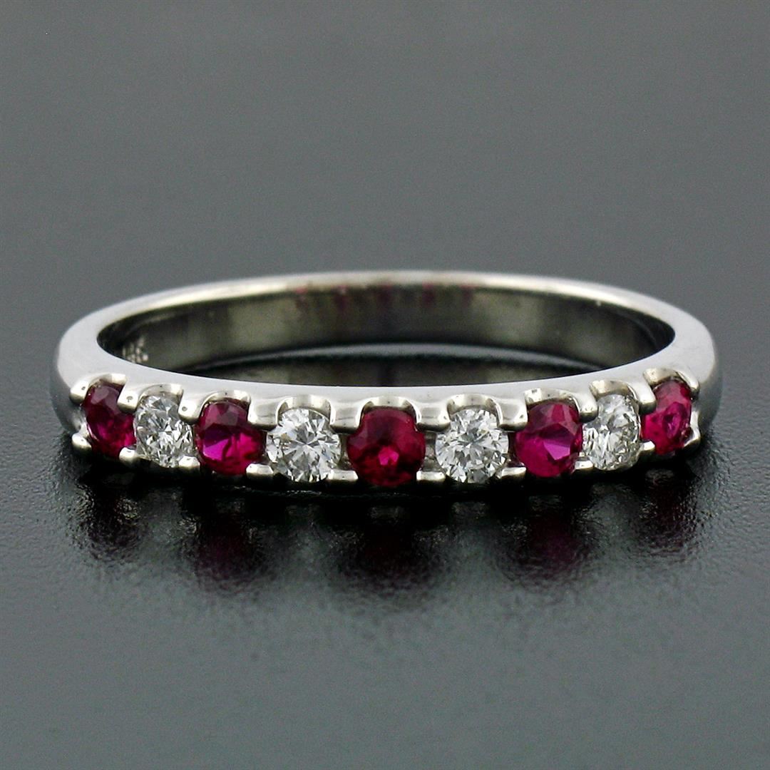 A new 14k white gold band ring, with 5 round brilliant cut natural rubies (0.34ctw), alternated with 4 round brilliant cut natural diamonds (F/G- VS1/VS2; 0.28ctw). The ring is size 7.0, weighs a total of 2.59 grams, and measures 3.0mm wide.