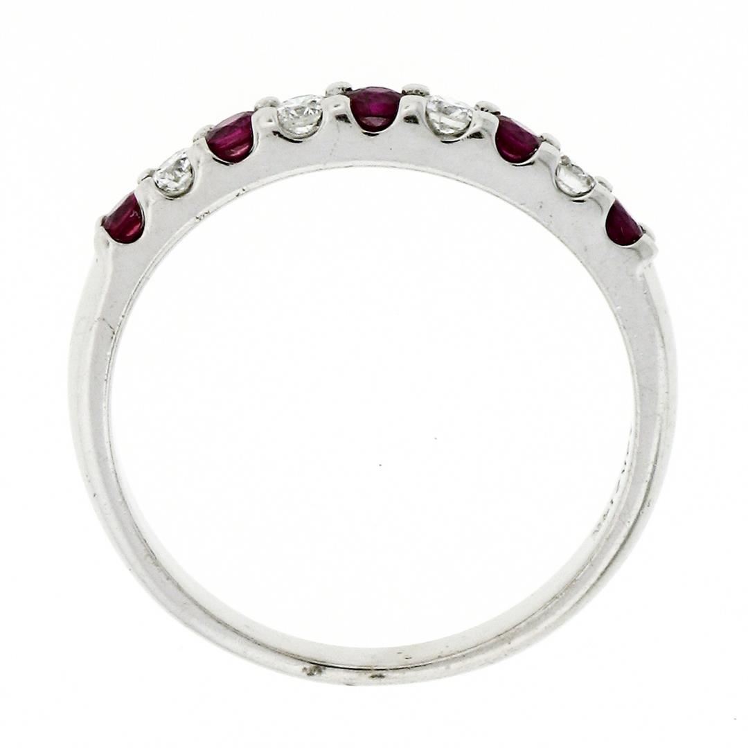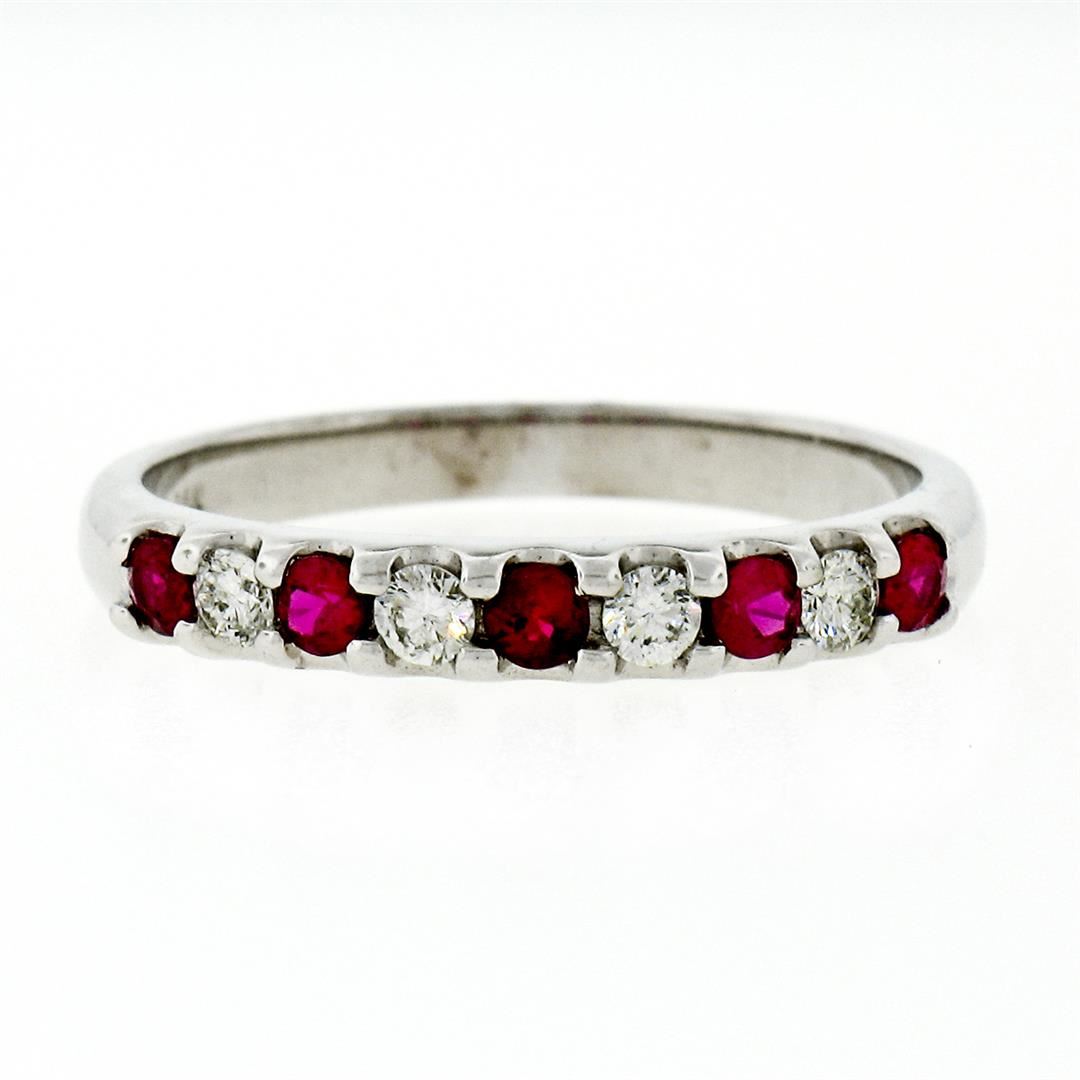A new 14k white gold band ring, with 5 round brilliant cut natural rubies (0.34ctw), alternated with 4 round brilliant cut natural diamonds (F/G- VS1/VS2; 0.28ctw). The ring is size 7.0, weighs a total of 2.59 grams, and measures 3.0mm wide.