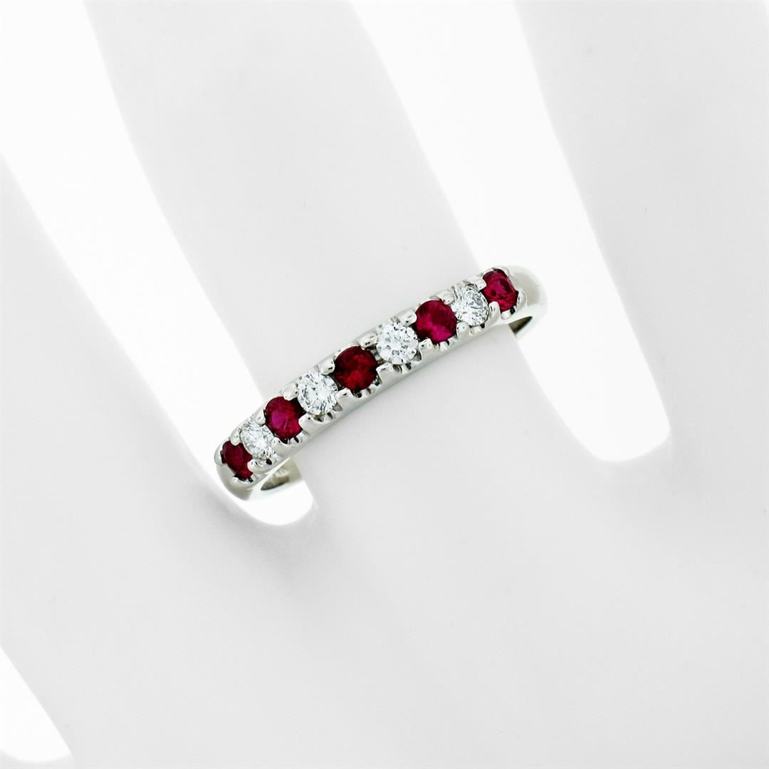 A new 14k white gold band ring, with 5 round brilliant cut natural rubies (0.34ctw), alternated with 4 round brilliant cut natural diamonds (F/G- VS1/VS2; 0.28ctw). The ring is size 7.0, weighs a total of 2.59 grams, and measures 3.0mm wide.