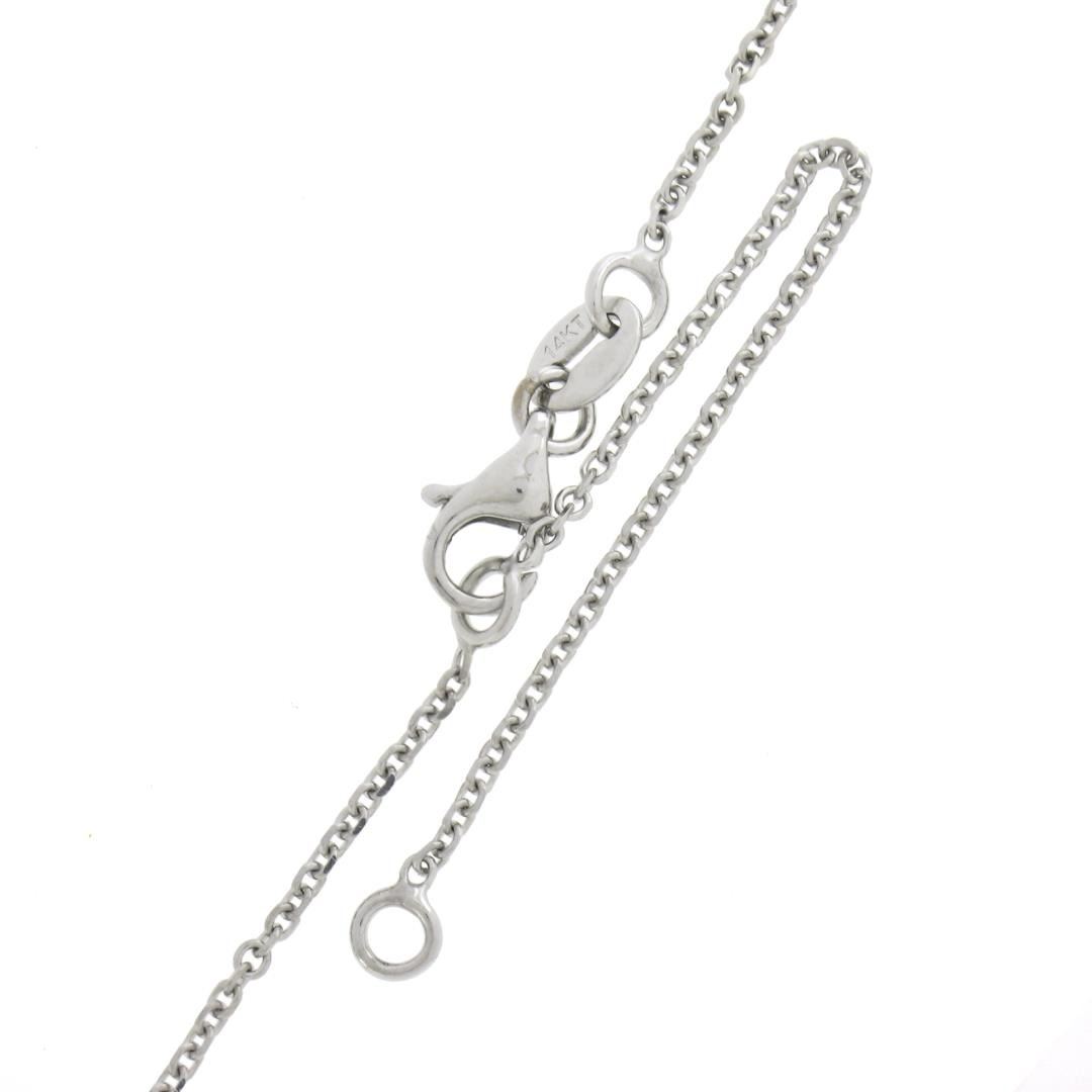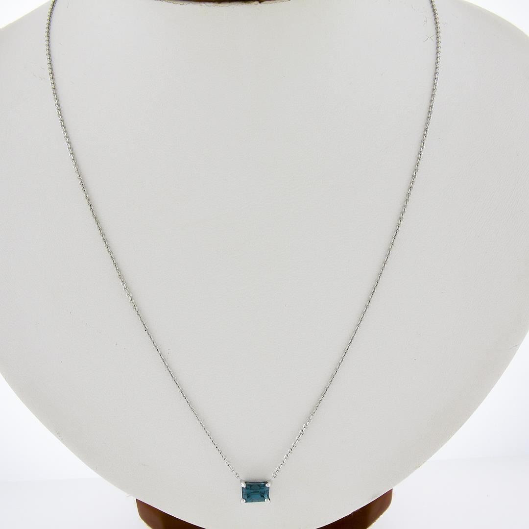 A new solid 14k white gold pendant necklace, with 1 rectangular cut natural blue zircon (1.89ct). Adjustable16 or 18 inch cable link chain, 2.81 grams total weight, pendant measures 4.8x6.7mm.