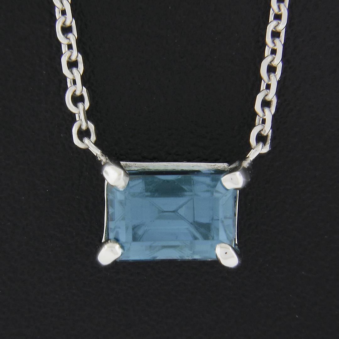 A new solid 14k white gold pendant necklace, with 1 rectangular cut natural blue zircon (1.89ct). Adjustable16 or 18 inch cable link chain, 2.81 grams total weight, pendant measures 4.8x6.7mm.