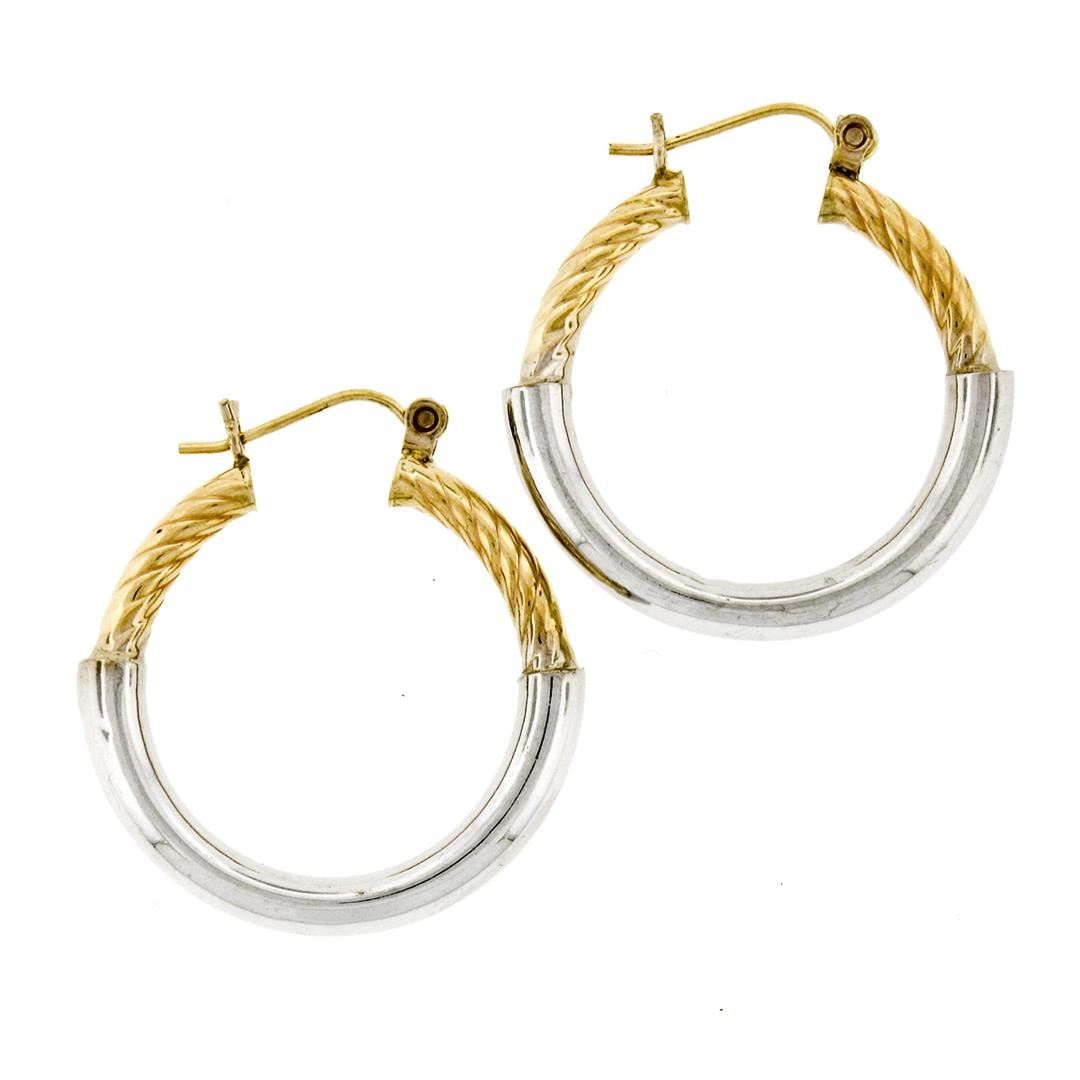 A new solid 14k white and yellow gold hoop earrings. The earrings measure approximately 28.70x26.70mm and weigh a total of 3.5 grams.