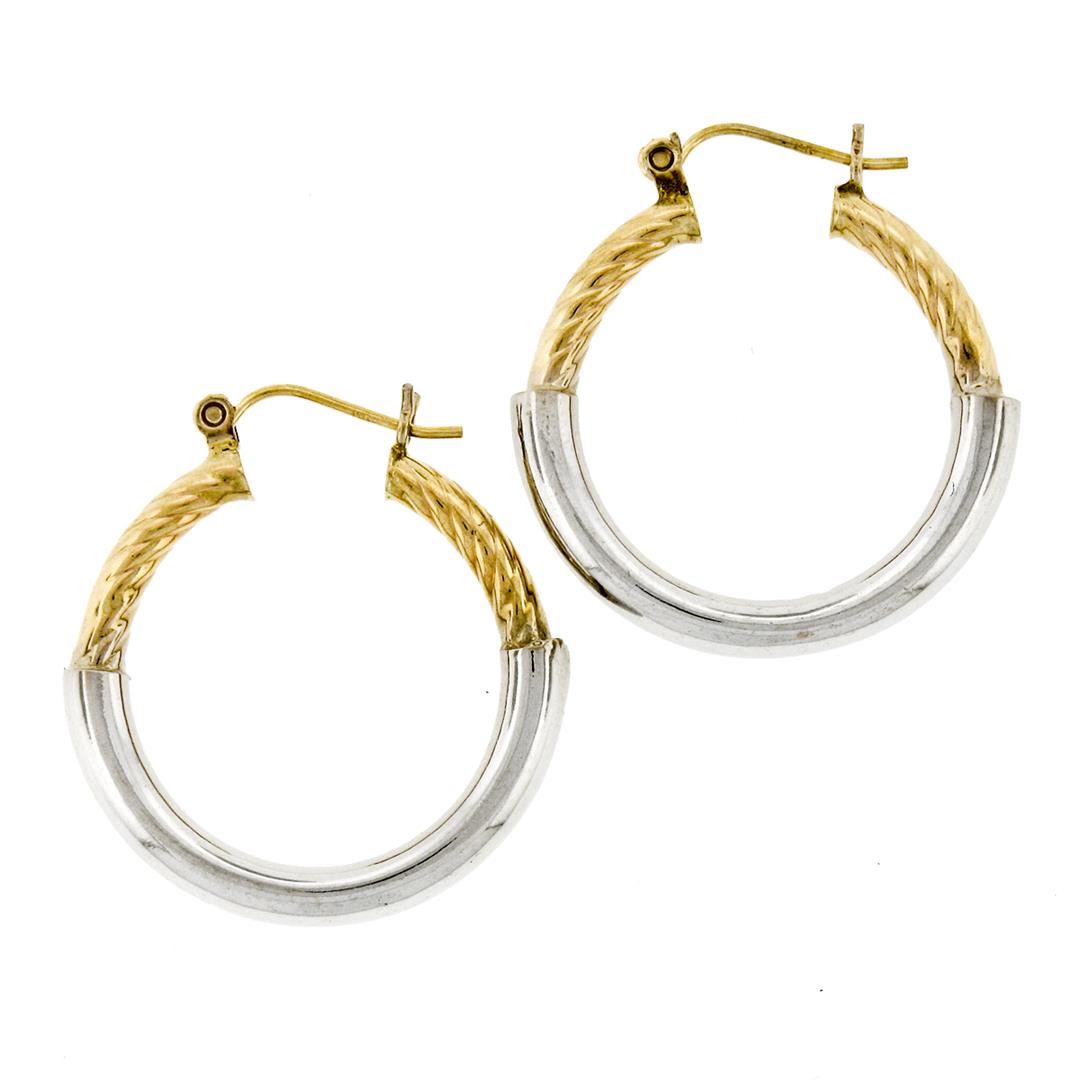 A new solid 14k white and yellow gold hoop earrings. The earrings measure approximately 28.70x26.70mm and weigh a total of 3.5 grams.