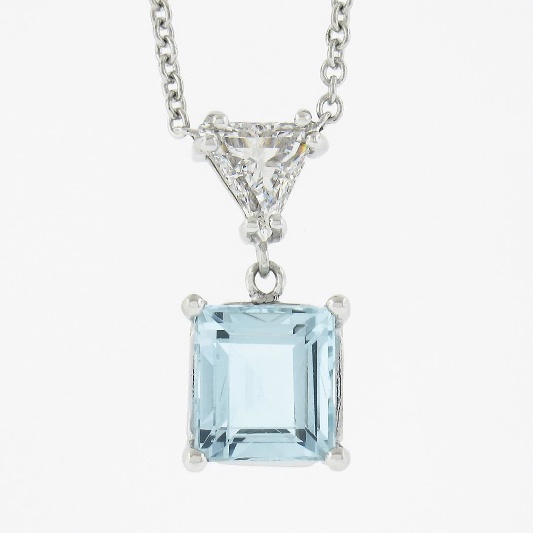 A new solid 14k white gold pendant necklace, with 1 square step cut natural aquamarine (1.43ct), and 1 trillion cut natrual diamond (G - SI1 ; 0.43ct). Adjustable at 16 or 18 inch cable link chain, 3.59 grams total weight, pendant measures 15.9x7.6mm.