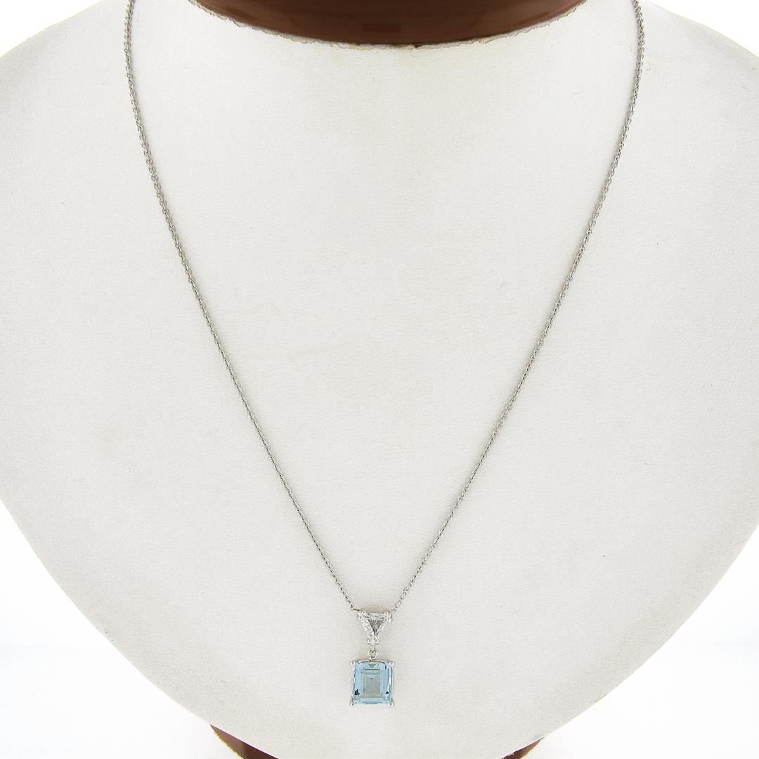 A new solid 14k white gold pendant necklace, with 1 square step cut natural aquamarine (1.43ct), and 1 trillion cut natrual diamond (G - SI1 ; 0.43ct). Adjustable at 16 or 18 inch cable link chain, 3.59 grams total weight, pendant measures 15.9x7.6mm.