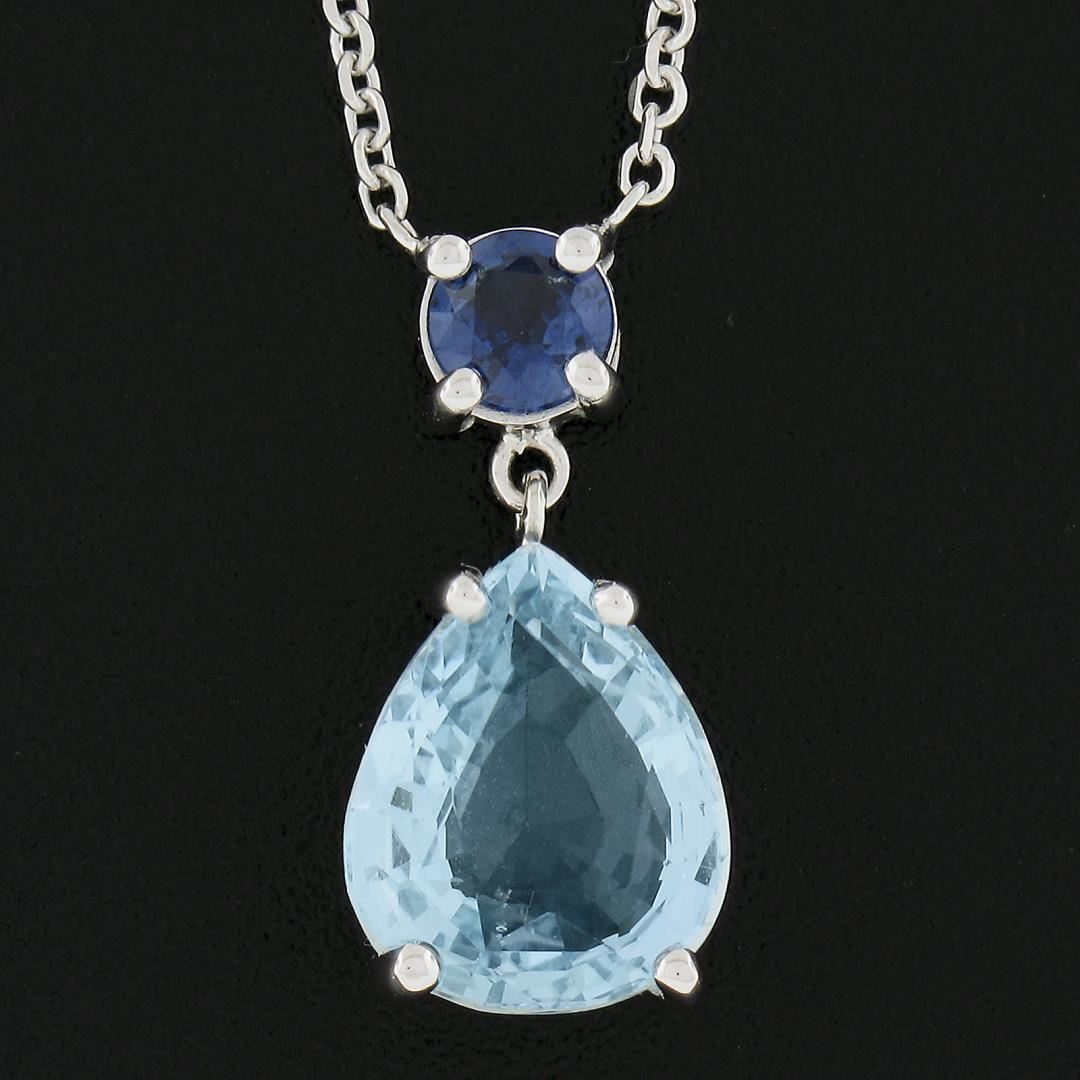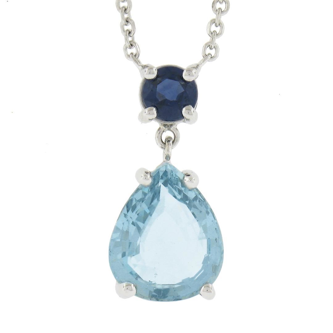 New 14k Gold 2.44ctw Pear Aquamarine & Sapphire Pendant & Adjustable Cable Chain