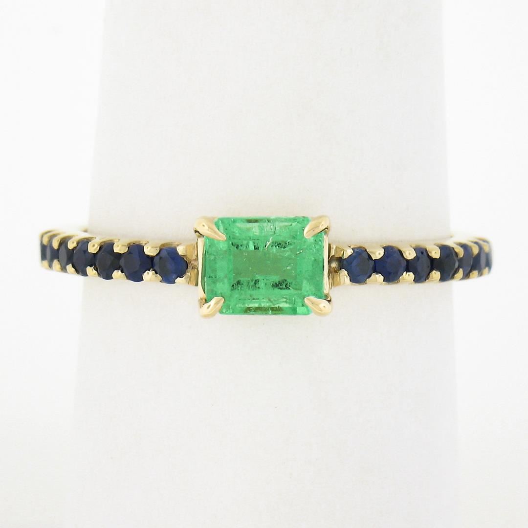 A new solid 14k yellow gold ring, with 1 sideways emerald cut natural emerald ( 0.67 ct), and 14 round cut natural sapphires (0.35 ctw). The ring is size 8.0, weighs a total of 2.75 grams, and measures 4.85mm wide.