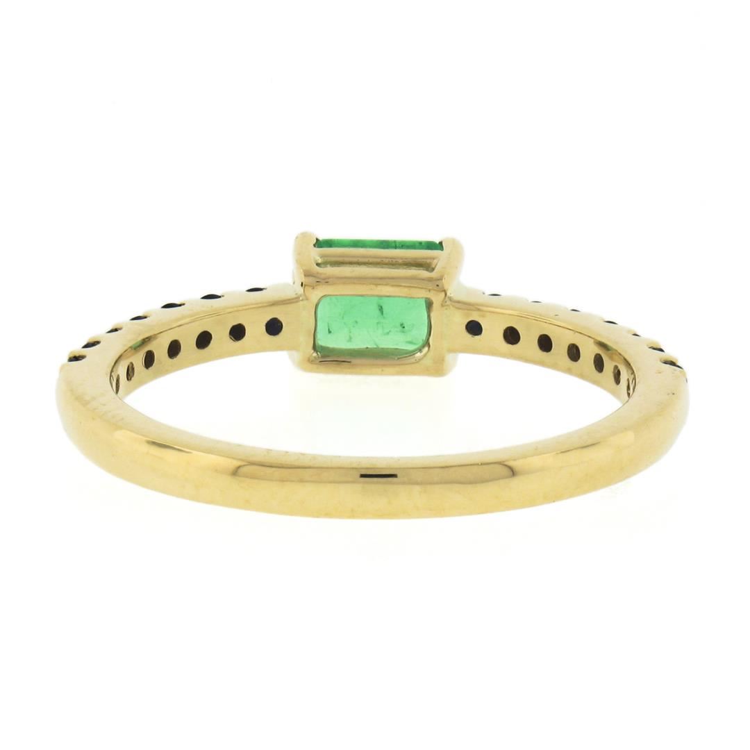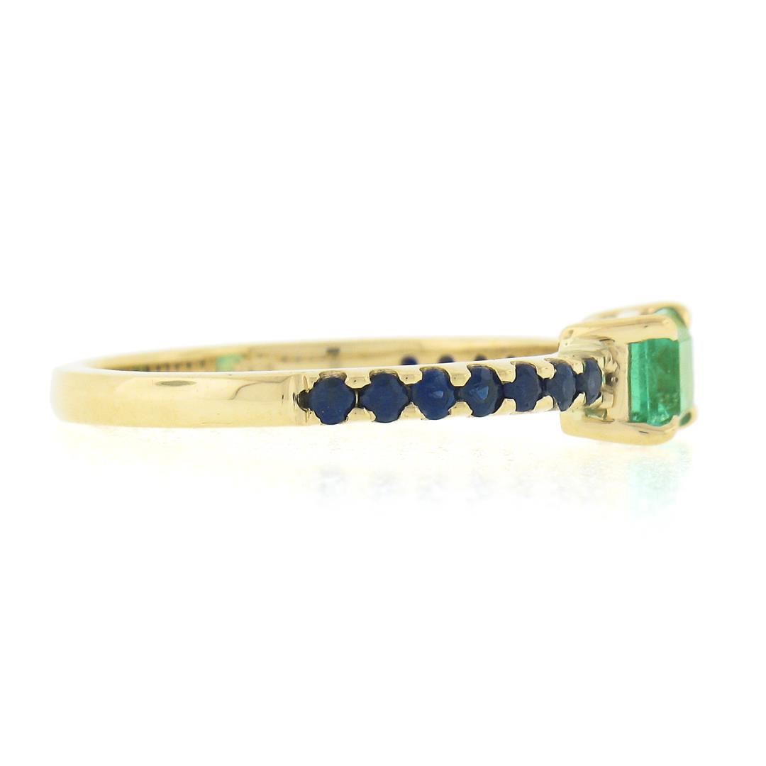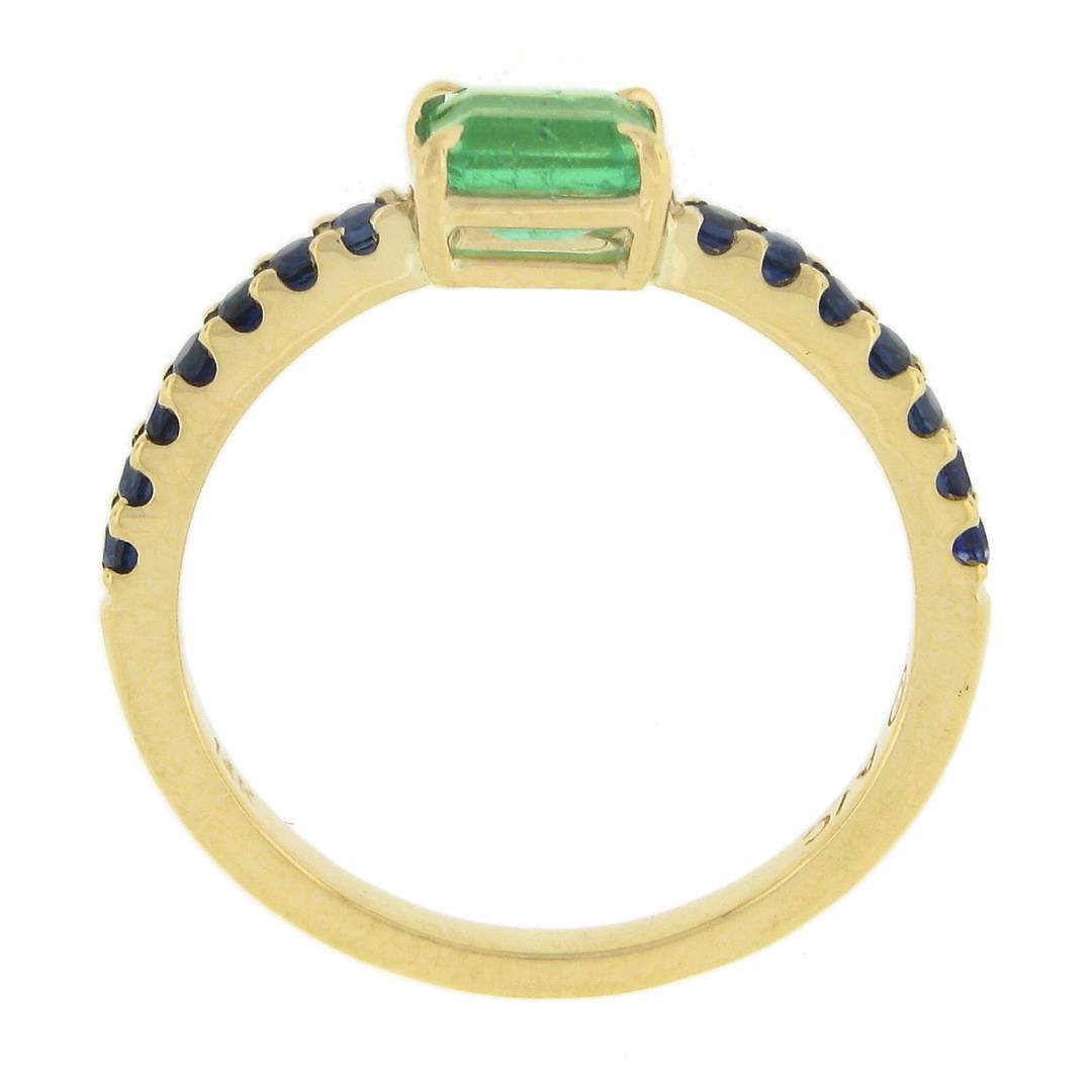 A new solid 14k yellow gold ring, with 1 sideways emerald cut natural emerald ( 0.67 ct), and 14 round cut natural sapphires (0.35 ctw). The ring is size 8.0, weighs a total of 2.75 grams, and measures 4.85mm wide.