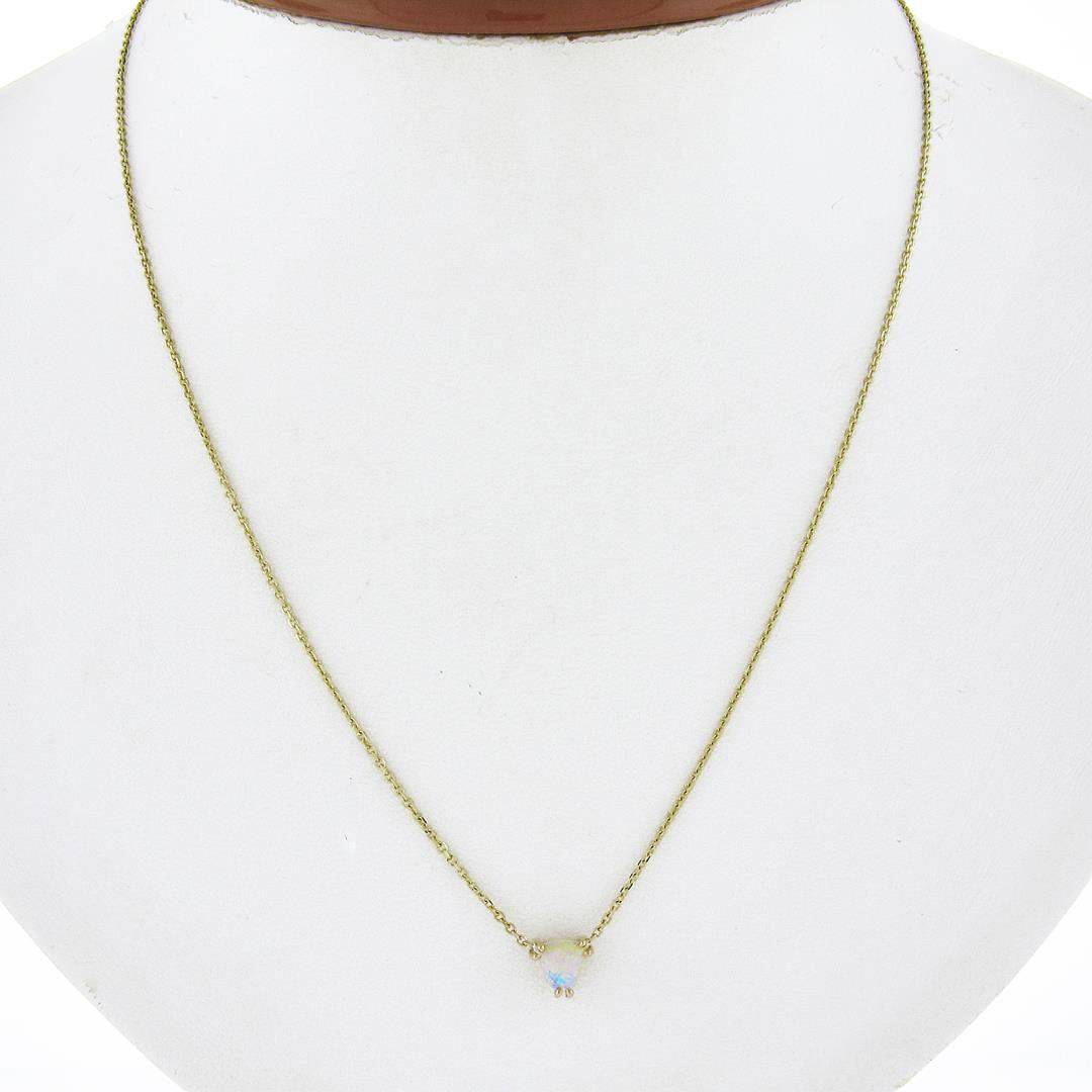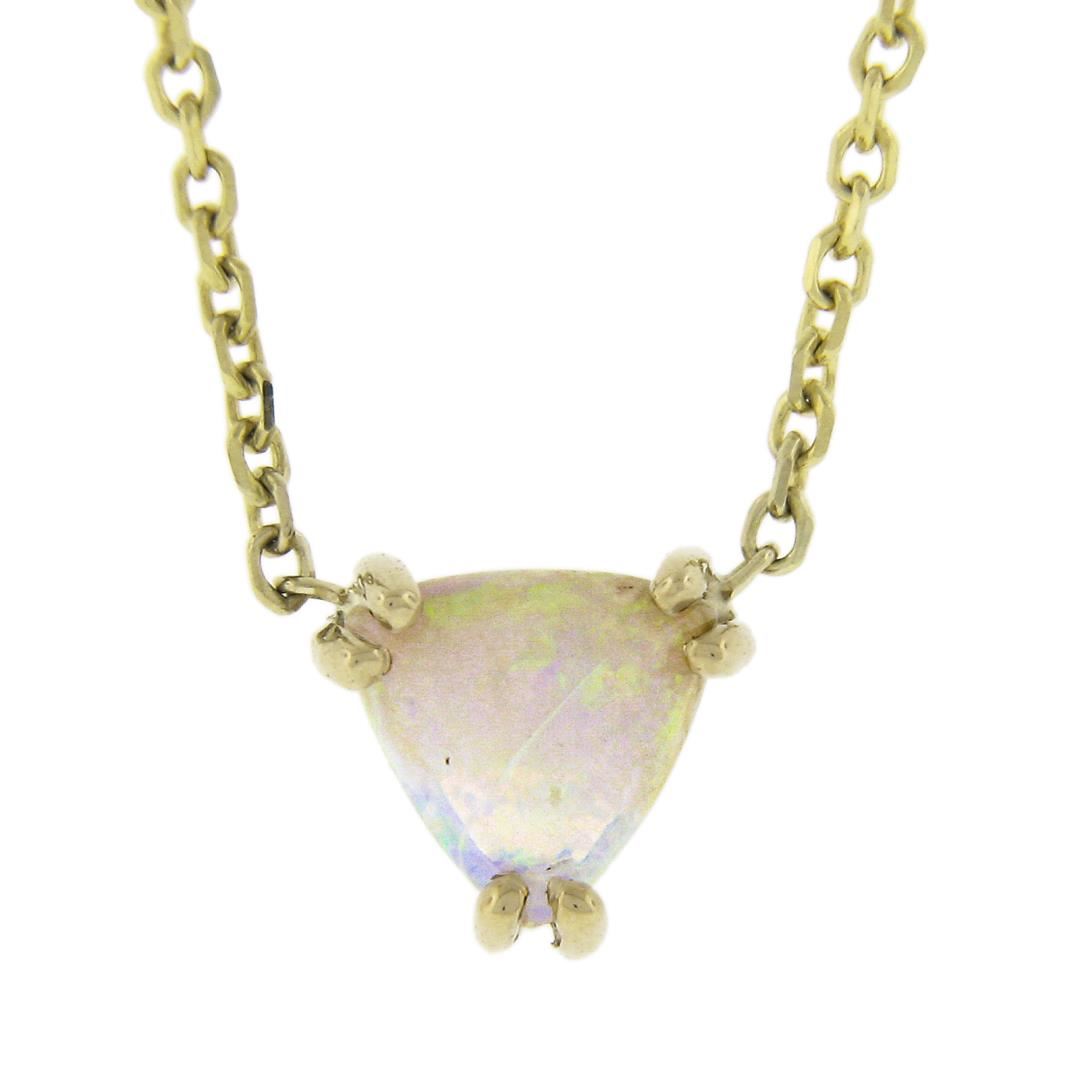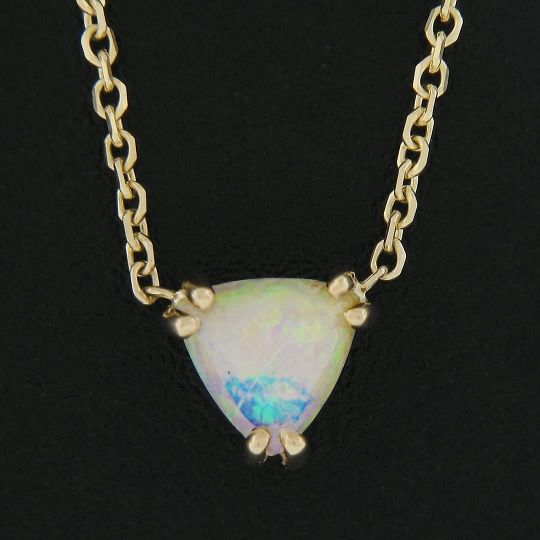 A new solid 14k yellow gold pendant necklace, with 1 trillion cabochon cut natural opal (0.36ct ). Adjustable 16 or 18 inch cable link chain, 2.22 grams total weight, pendant measures 6.5x6.5mm.