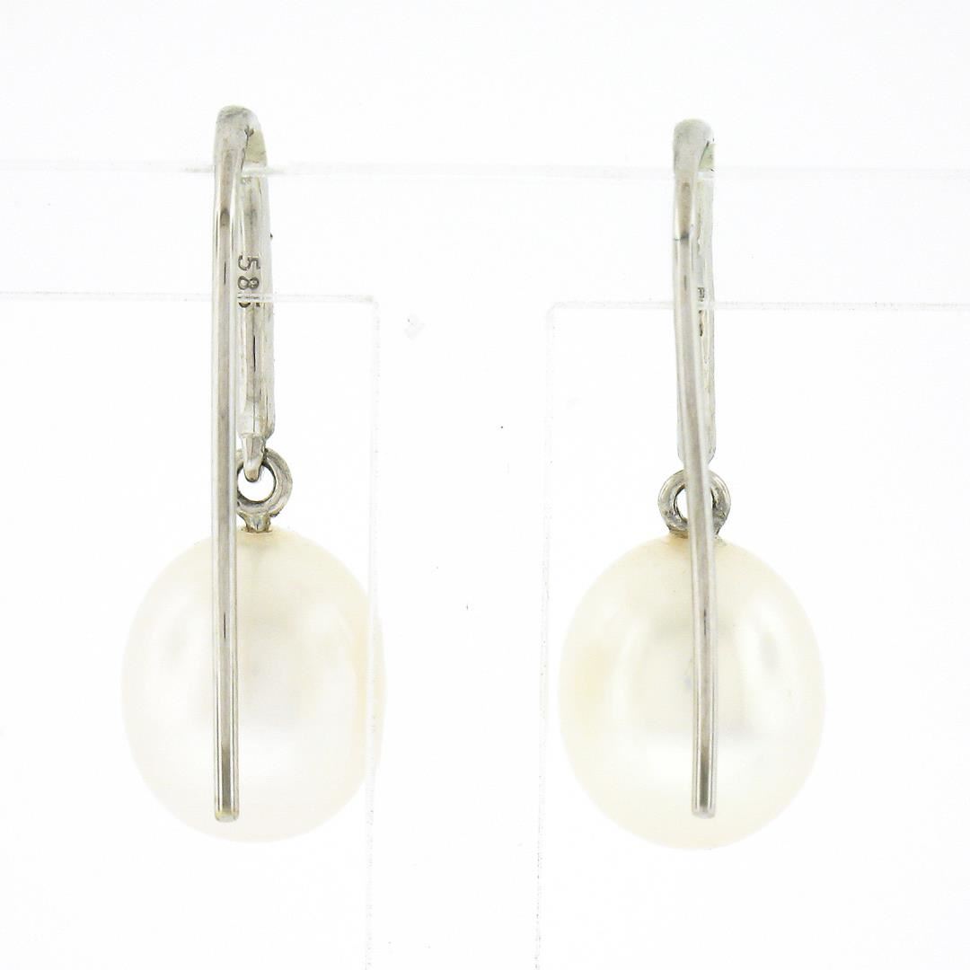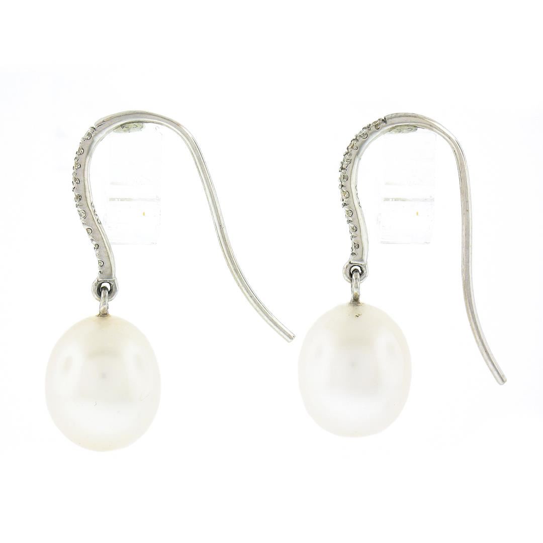 A new solid 14k white gold drop dangle earrings, with 2 oval shape cultured pearls (10.5x8.7mm each), and 18 round brilliant cut natural diamonds (G/H - VS1/VS2 ; 0.10ctw). The earrings measure approximately 24x8.7mm and weigh a total of 3.10 grams.