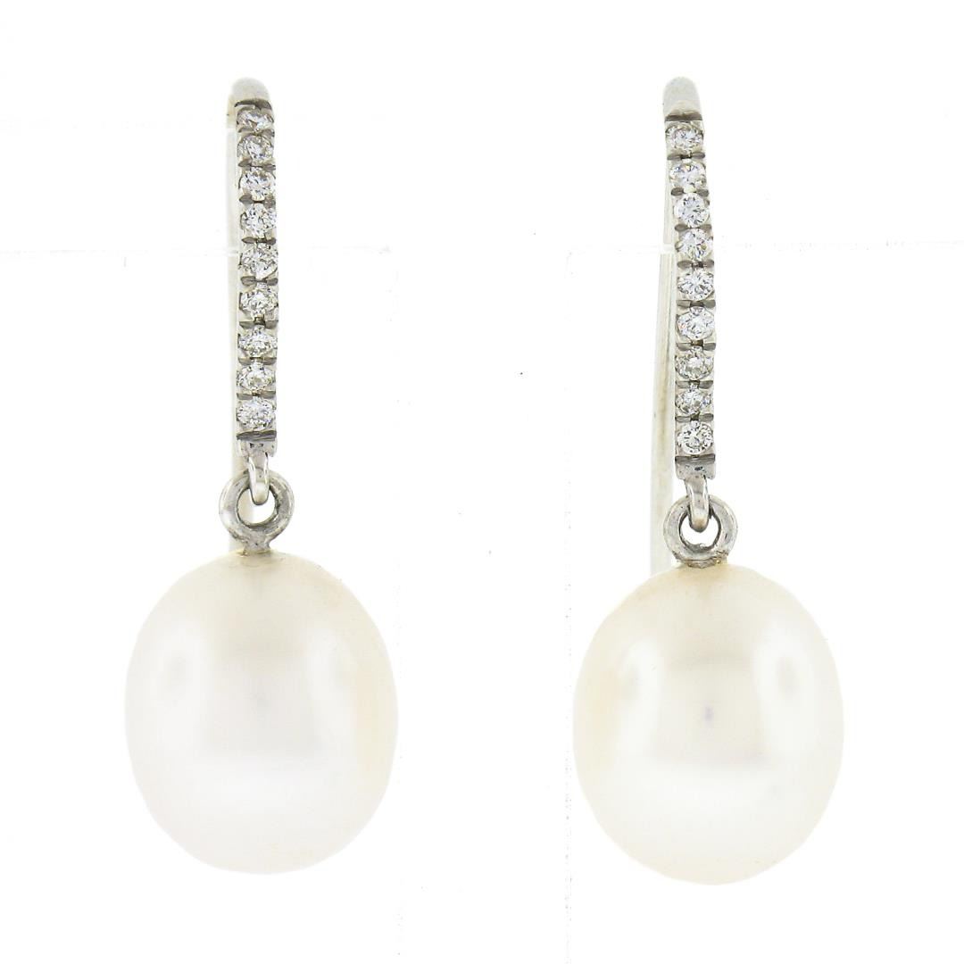 A new solid 14k white gold drop dangle earrings, with 2 oval shape cultured pearls (10.5x8.7mm each), and 18 round brilliant cut natural diamonds (G/H - VS1/VS2 ; 0.10ctw). The earrings measure approximately 24x8.7mm and weigh a total of 3.10 grams.