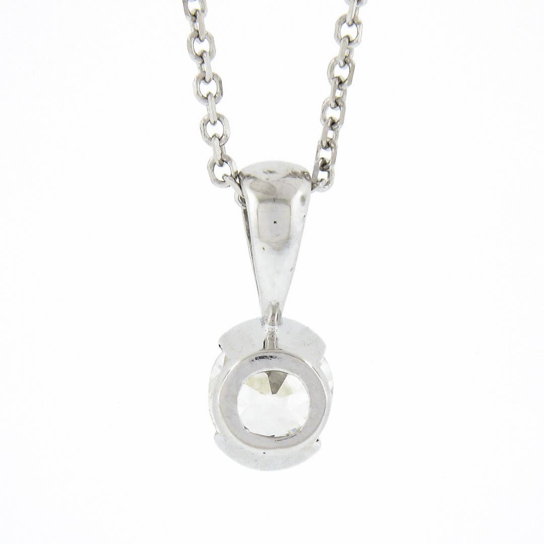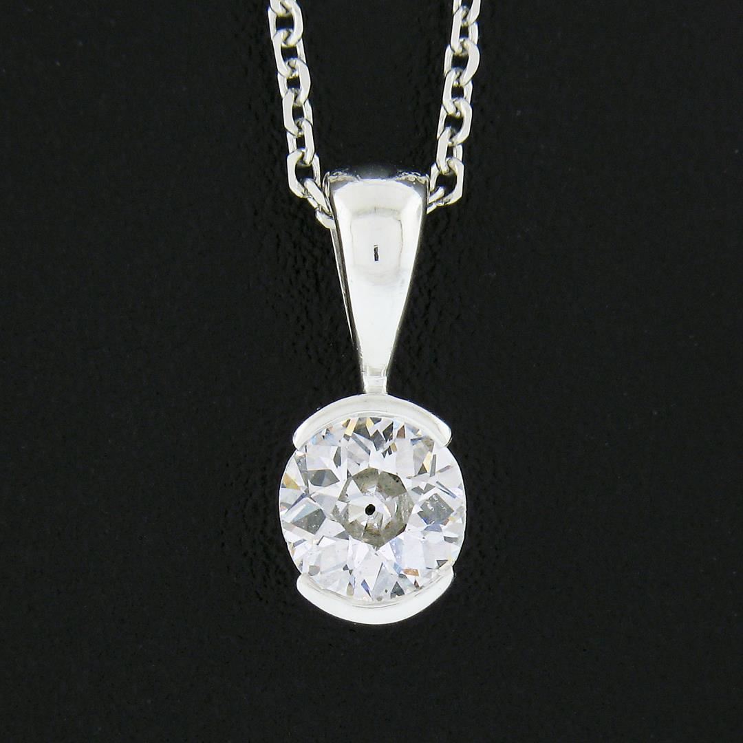 A new solid 14k white gold solitaire pendant necklace, with 1 old European cut natural diamond (H- VS2 ; 0.56ct). 18 inch cable link chain, 2.48 grams total weight, pendant measures 12.8x5.1mm.
