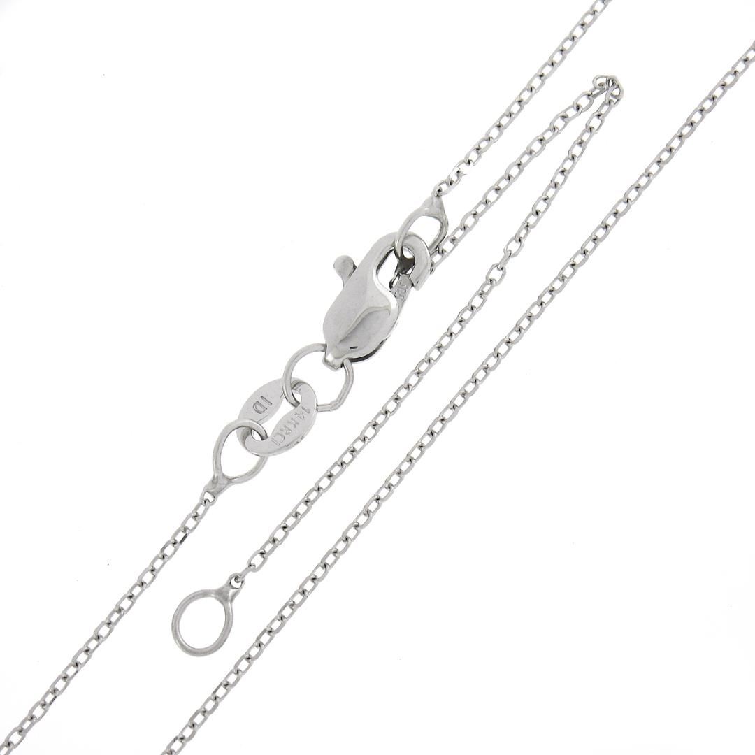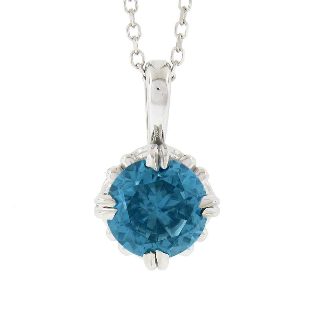 A new solid 14k white gold pendant necklace, with 1 round cut natural zircon (1.5ct). Adjustable 16 or 18 inch cable link chain, 2.02 grams total weight, pendant measures 12.5x7.6mm.