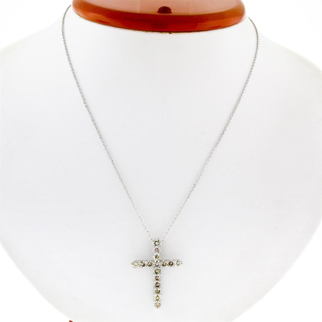 A new 14k white gold cross pendant necklace featuring 16 round brilliant diamonds of various light fancy colors (VS1/VS2; 1.52ctw). 18 inch cable link chain, 4.35 grams total weight, pendant measures 28.25x20.60mm.