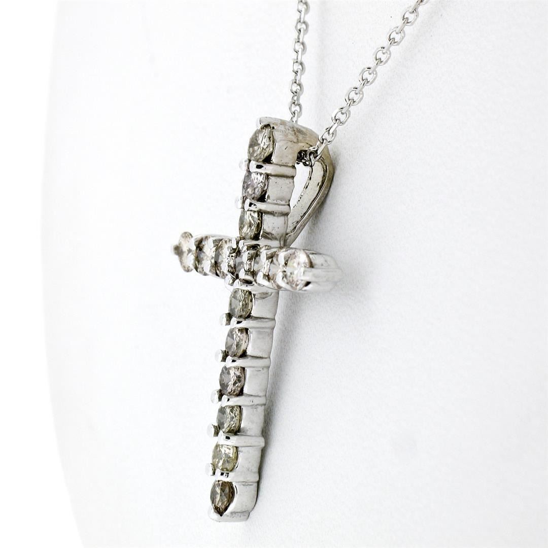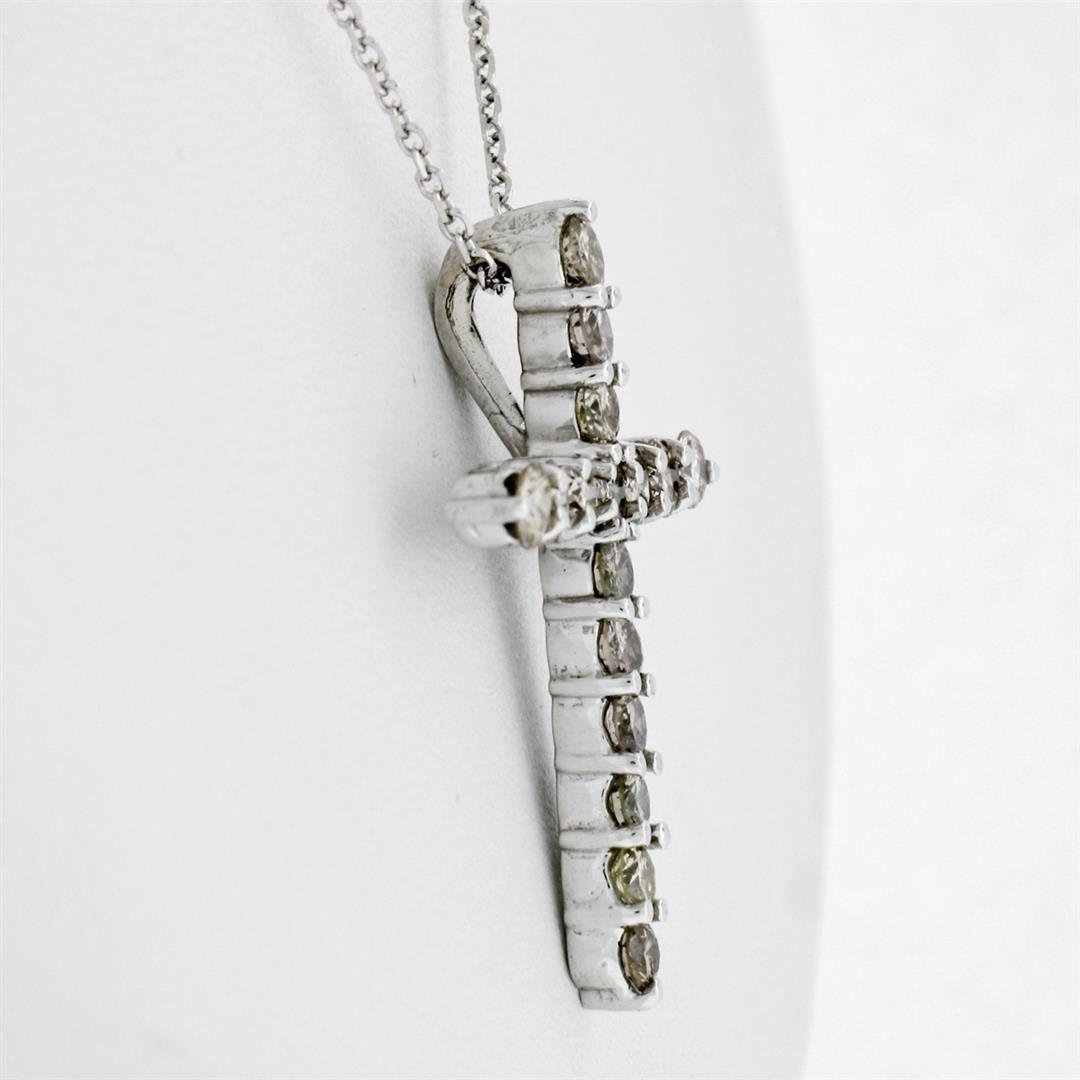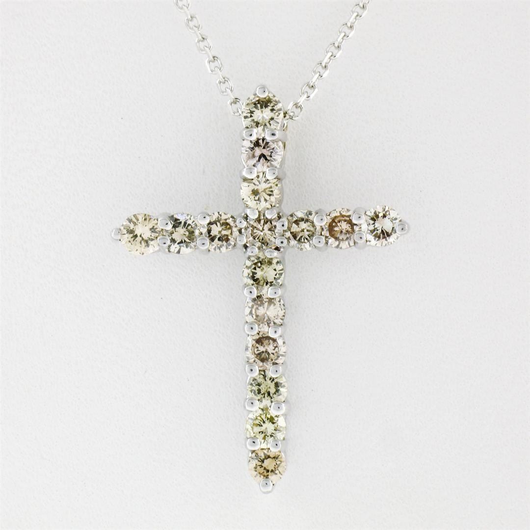 A new 14k white gold cross pendant necklace featuring 16 round brilliant diamonds of various light fancy colors (VS1/VS2; 1.52ctw). 18 inch cable link chain, 4.35 grams total weight, pendant measures 28.25x20.60mm.