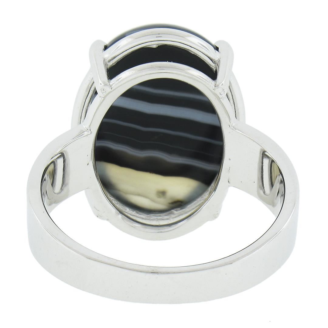 A new solid 14k white gold ring, with 1 oval cabochon cut natural agate (18.2x13mm). The ring is size 8.0, weighs a total of 6.81 grams, and measures 18.8mm wide.
