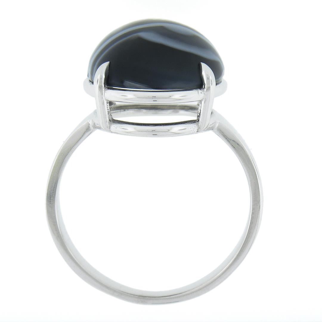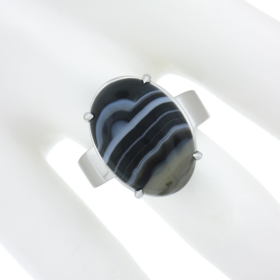 A new solid 14k white gold ring, with 1 oval cabochon cut natural agate (18.2x13mm). The ring is size 8.0, weighs a total of 6.81 grams, and measures 18.8mm wide.