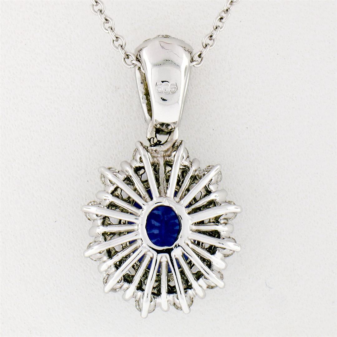 A new solid 14k white gold pendant necklace, with 1 oval brilliant cut natural tsavorite (9.7x7.6mm - 1.85ct), surrounded with a halo of 43 round brilliant cut natural diamonds (F/G - VS1/VS2 ; 0.74ctw). 16 inch cable link chain, 5.05 grams total weight, pendant measures 24.4x13.7mm.