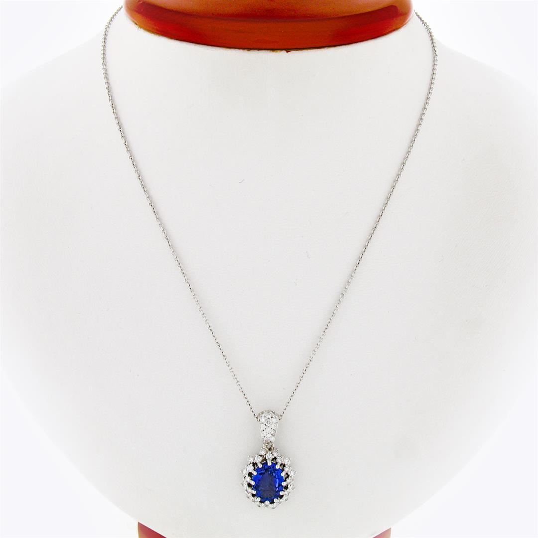 A new solid 14k white gold pendant necklace, with 1 oval brilliant cut natural tsavorite (9.7x7.6mm - 1.85ct), surrounded with a halo of 43 round brilliant cut natural diamonds (F/G - VS1/VS2 ; 0.74ctw). 16 inch cable link chain, 5.05 grams total weight, pendant measures 24.4x13.7mm.