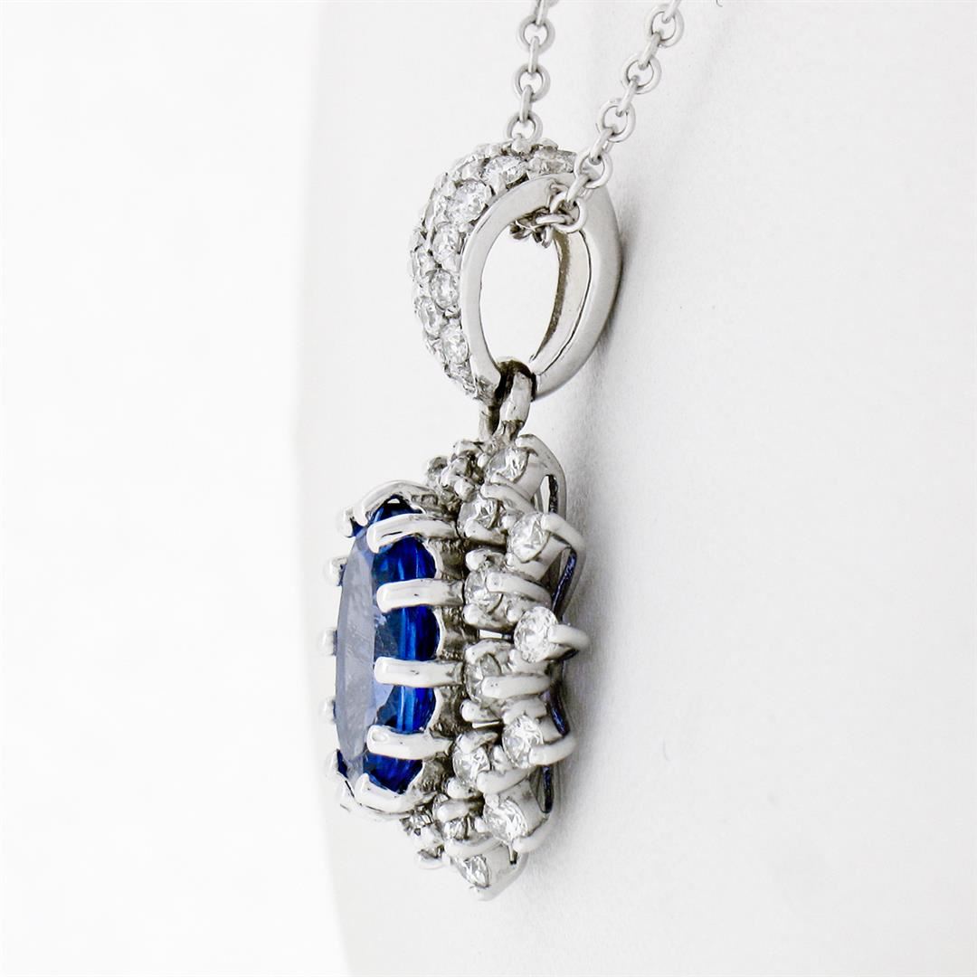A new solid 14k white gold pendant necklace, with 1 oval brilliant cut natural tsavorite (9.7x7.6mm - 1.85ct), surrounded with a halo of 43 round brilliant cut natural diamonds (F/G - VS1/VS2 ; 0.74ctw). 16 inch cable link chain, 5.05 grams total weight, pendant measures 24.4x13.7mm.