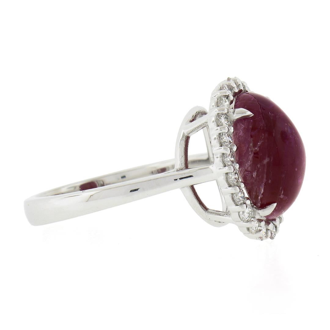 A new solid 14k white gold ring, with 1 GIA graded oval cabochon cut natural ruby (7.44ct ), and a halo of 22 round cut natural diamonds (G/H - VS1-SI1 ; 0.46ctw). The ring is size 6.5, weighs a total of 5.67 grams, and measures 16mm wide. Comes with all original relevant certifications.