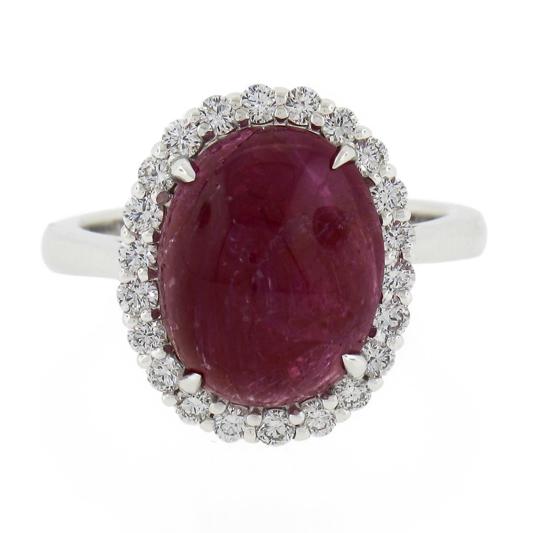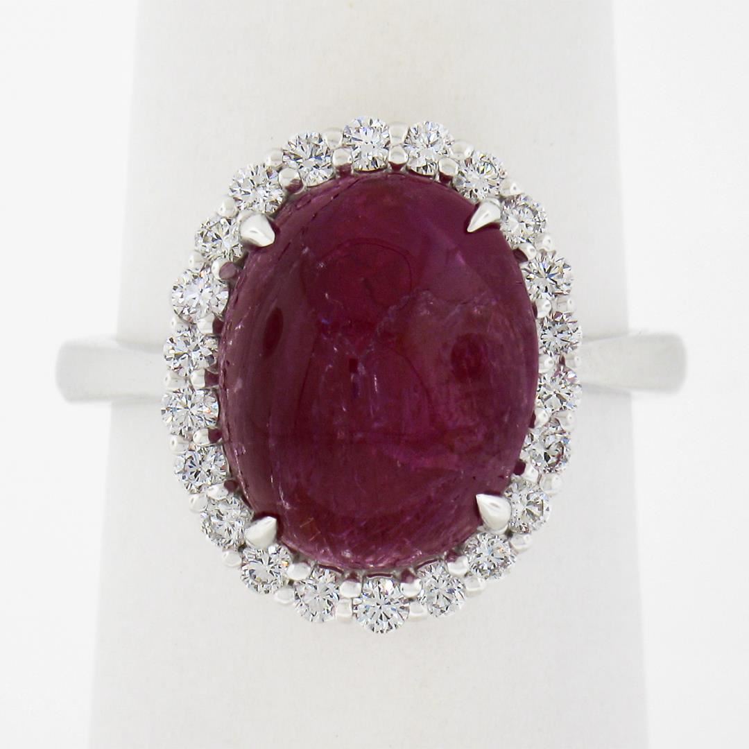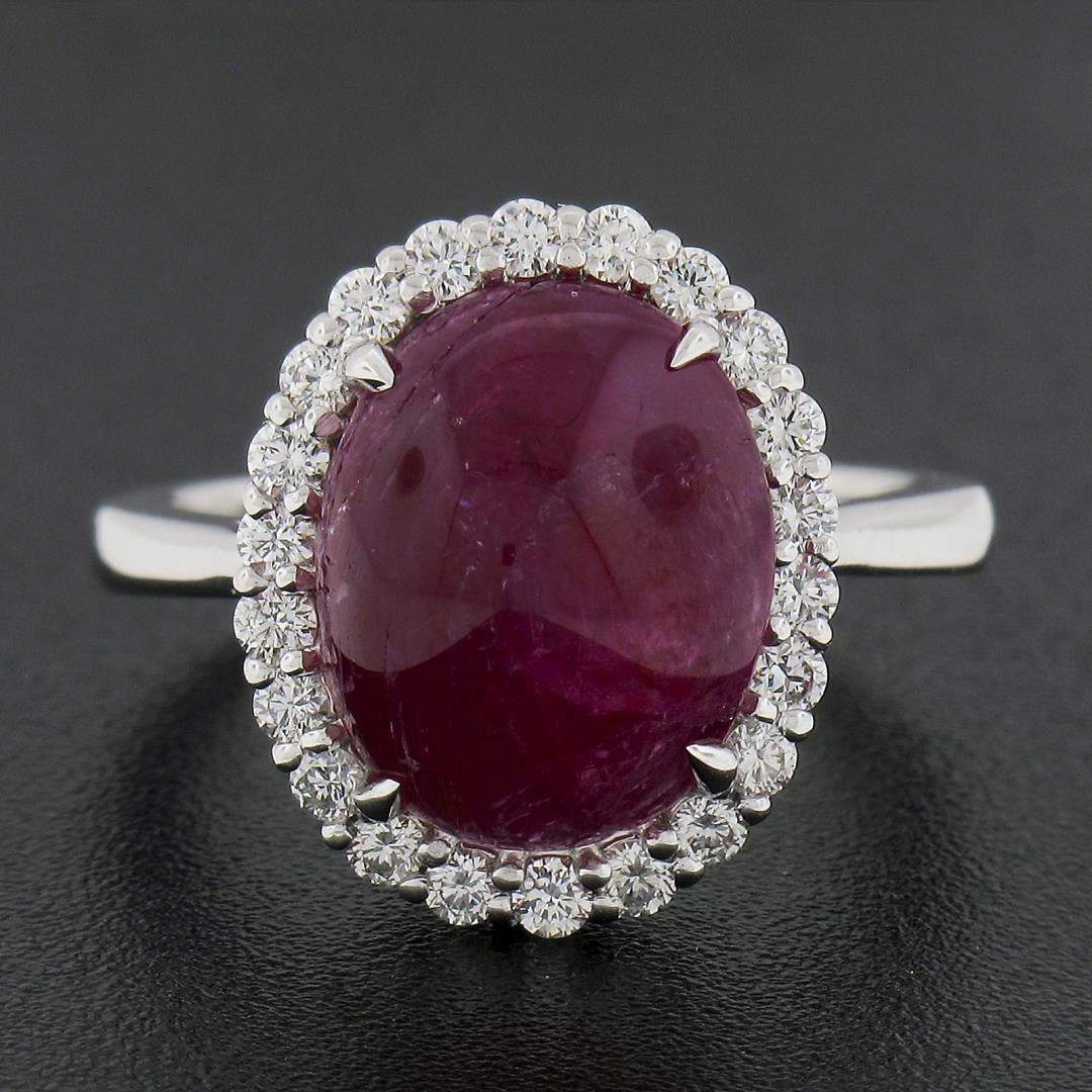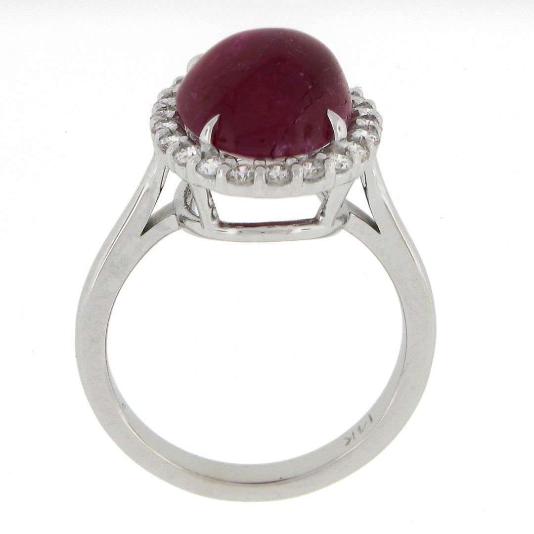 A new solid 14k white gold ring, with 1 GIA graded oval cabochon cut natural ruby (7.44ct ), and a halo of 22 round cut natural diamonds (G/H - VS1-SI1 ; 0.46ctw). The ring is size 6.5, weighs a total of 5.67 grams, and measures 16mm wide. Comes with all original relevant certifications.