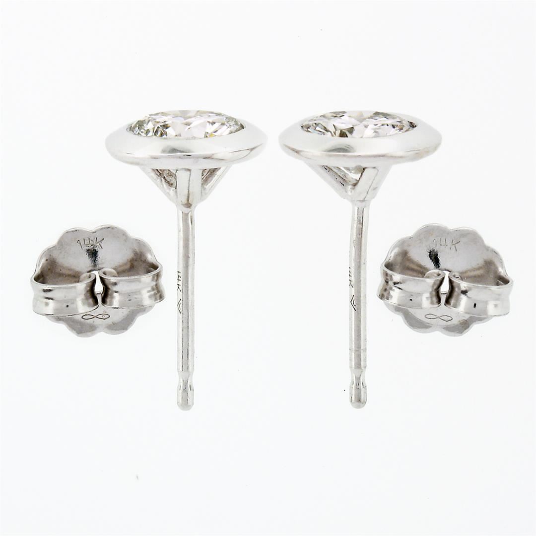 A new pair of solid 14k white gold stud earrings, with 2 round brilliant cut natural diamonds (G - VS2; 0.84ctw). The earrings measure approximately 7mm in diameter and weigh a total of 1.24 grams.