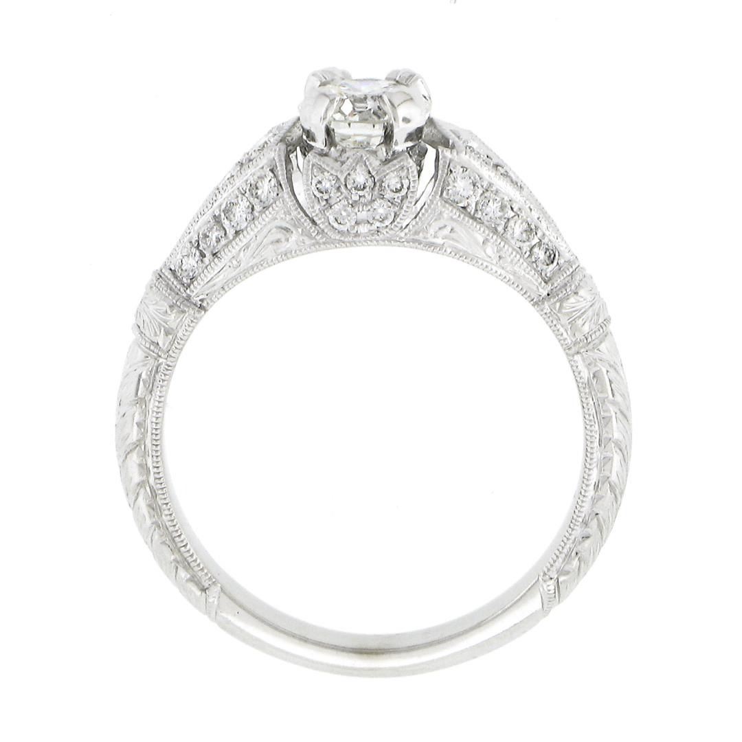 A new solid 14 white gold engraved ring, with 1 round brilliant cut natural diamond (H - VS2 ; 0.50ct), and 30 round brilliant cut natural diamonds (G/H - VS1/VS2 ; 0.35ctw). The ring is size 6.5, weighs a total of 3.46 grams, and measures 6.50mm wide.