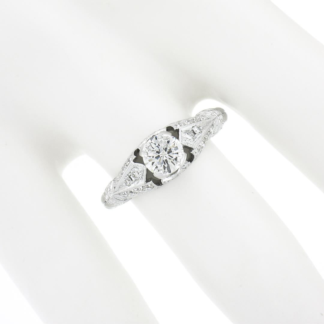 A new solid 14 white gold engraved ring, with 1 round brilliant cut natural diamond (H - VS2 ; 0.50ct), and 30 round brilliant cut natural diamonds (G/H - VS1/VS2 ; 0.35ctw). The ring is size 6.5, weighs a total of 3.46 grams, and measures 6.50mm wide.
