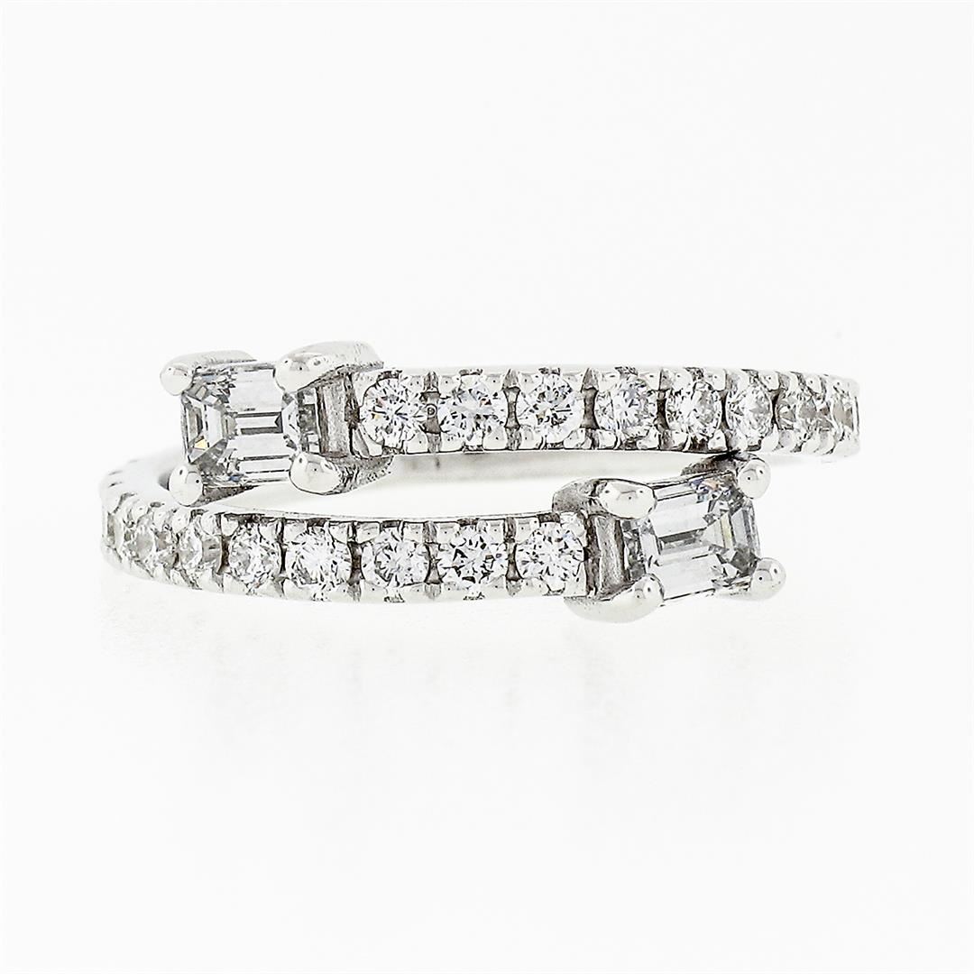 A New solid 14k white gold Moi et Toi bypass band ring, with 2 emerald cut natural diamonds (G/H - VS1 ; 0.42ctw ), and 26 round brilliant cut natural diamonds (G/H - VS1/VS2 ; 0.50ctw). The ring is size 6.0, weighs a total of 3.07 grams, and measures 7.9mm wide.