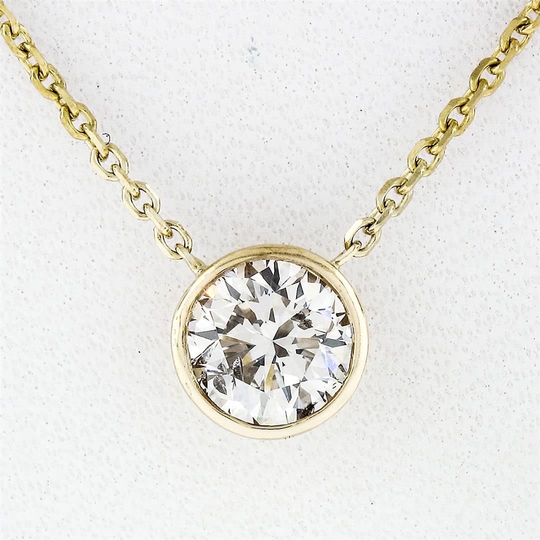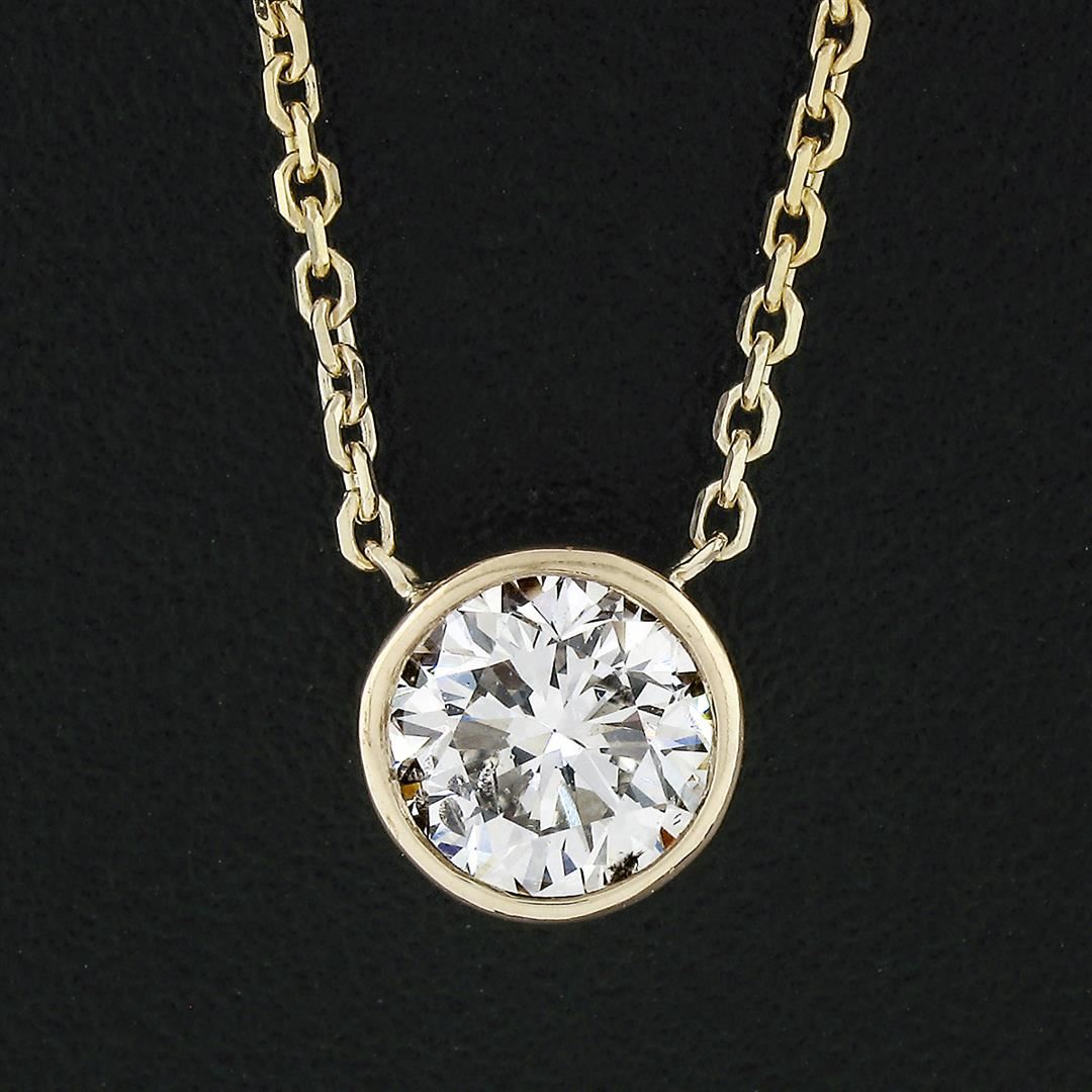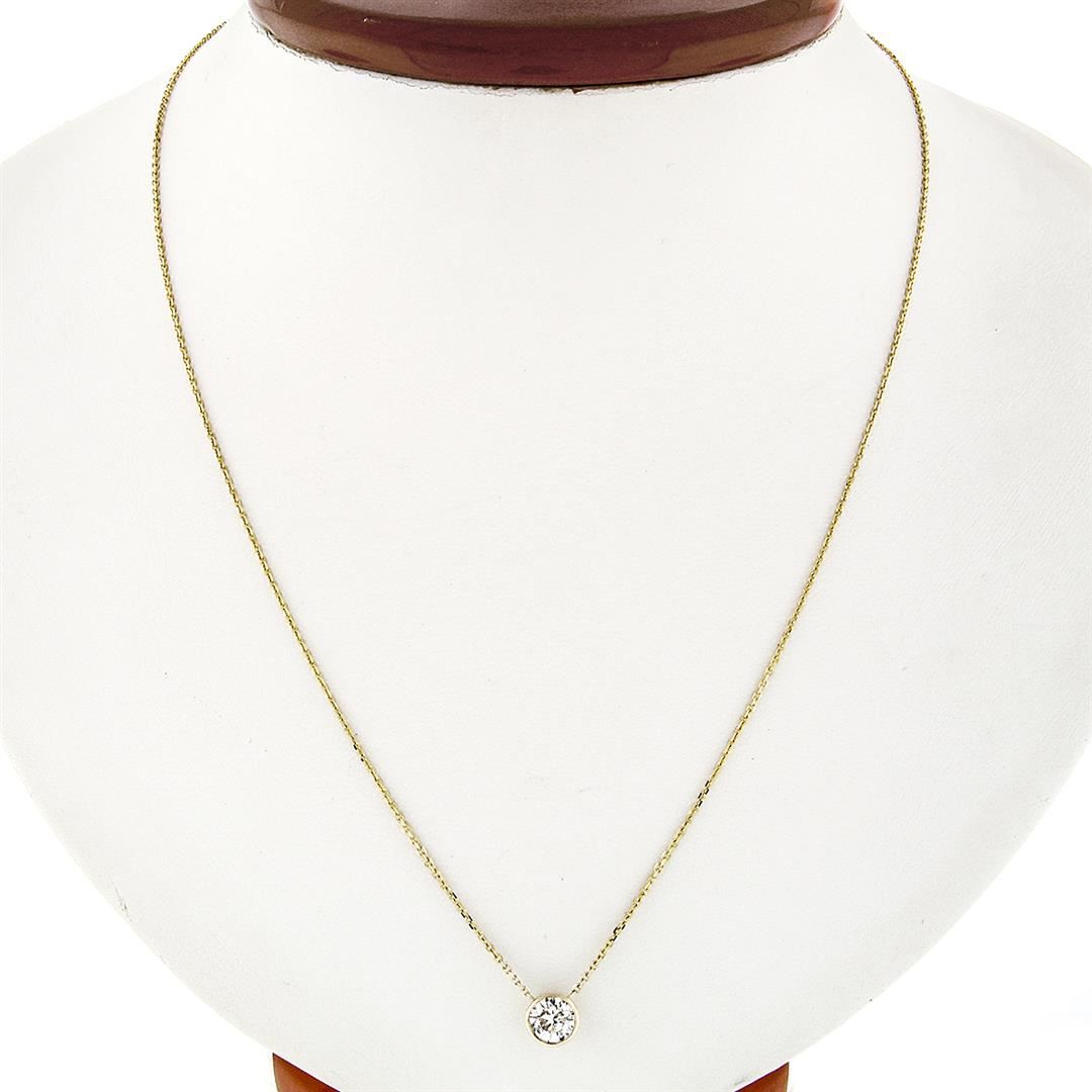 A New solid 14k yellow gold solitaire pendant necklace, with 1 round brilliant cut natural diamond (H - SI1 ; 0.65ct). 16 to 18 inch cable link chain, 2.29 grams total weight, pendant measures 6.4mm in diameter.