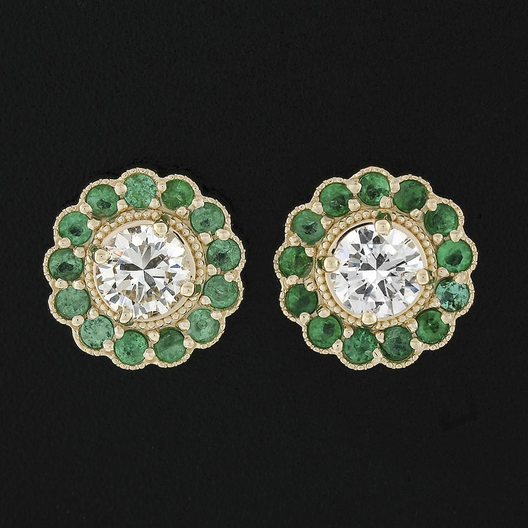 A new solid 14k yellow gold pair of flower cluster earrings, with 26 round brilliant cut natural emeralds (0.52ctw), and 2 round brilliant cut natural diamonds (H/I - VS1/VS2 ; 0.81ctw). The earrings measure approximately 10.7mm in diameter and weigh a total of 3.94 grams.