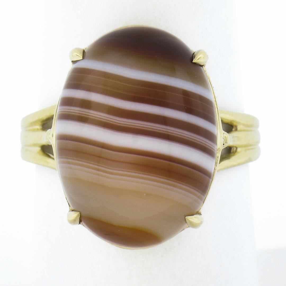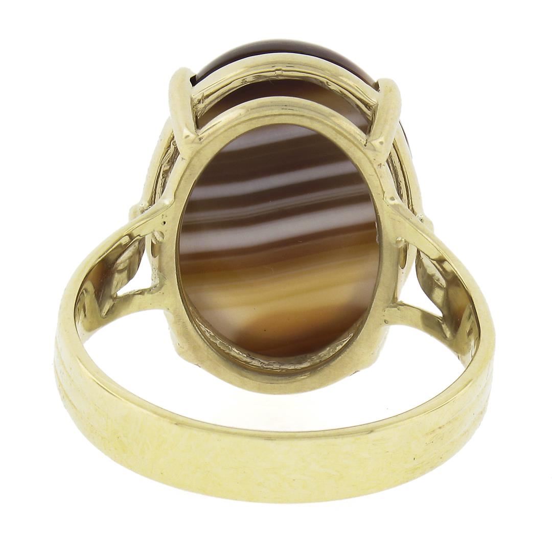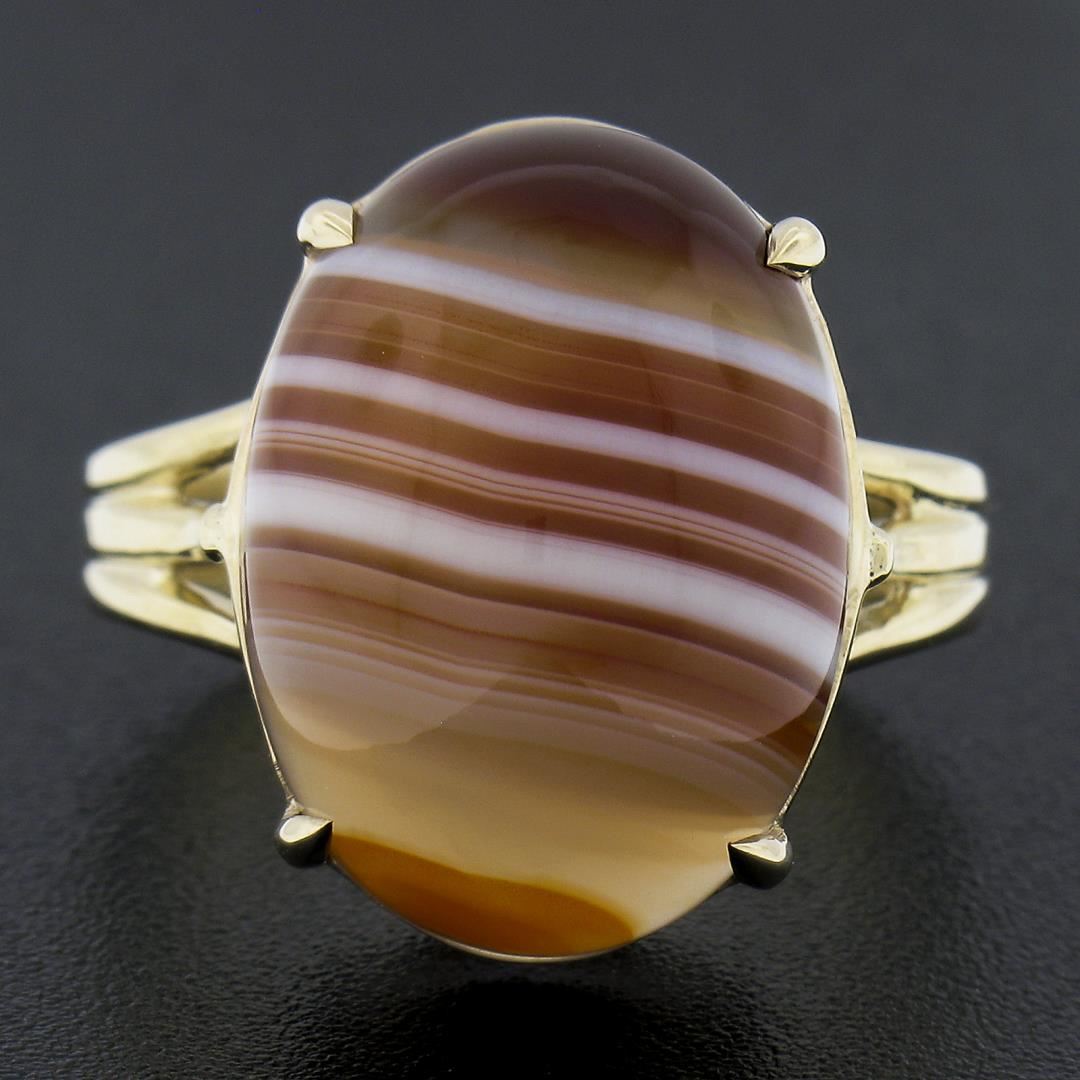 A new solid 14k yellow gold ring, with 1 oval cabochon cut natural agate (17.9x13.1mm). The ring is size 8.5, weighs a total of 5.91 grams, and measures 18.3mm wide.
