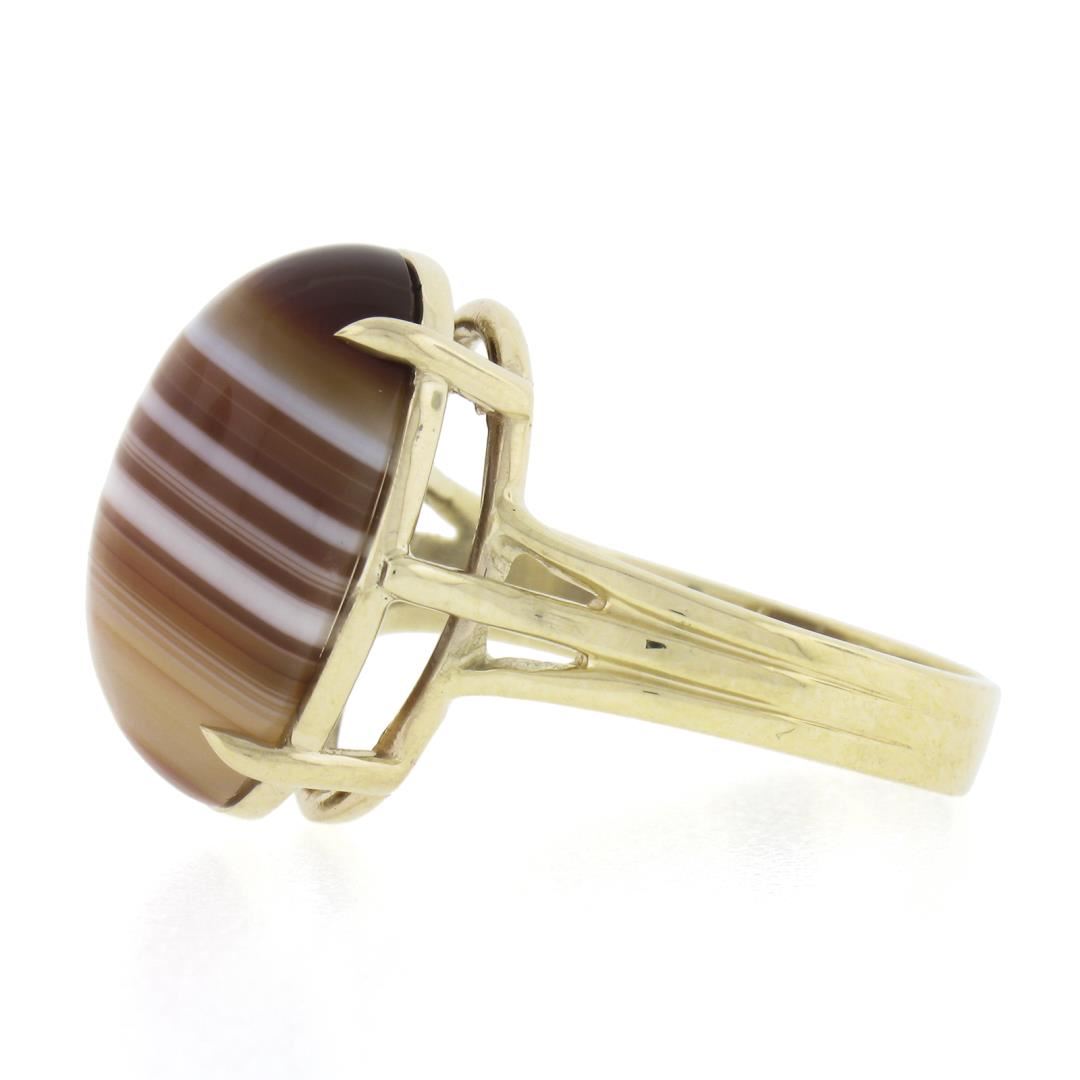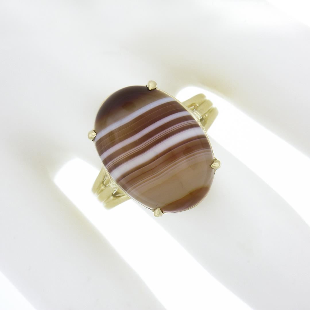 A new solid 14k yellow gold ring, with 1 oval cabochon cut natural agate (17.9x13.1mm). The ring is size 8.5, weighs a total of 5.91 grams, and measures 18.3mm wide.