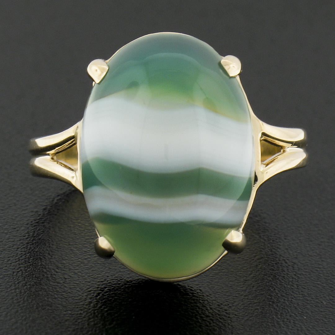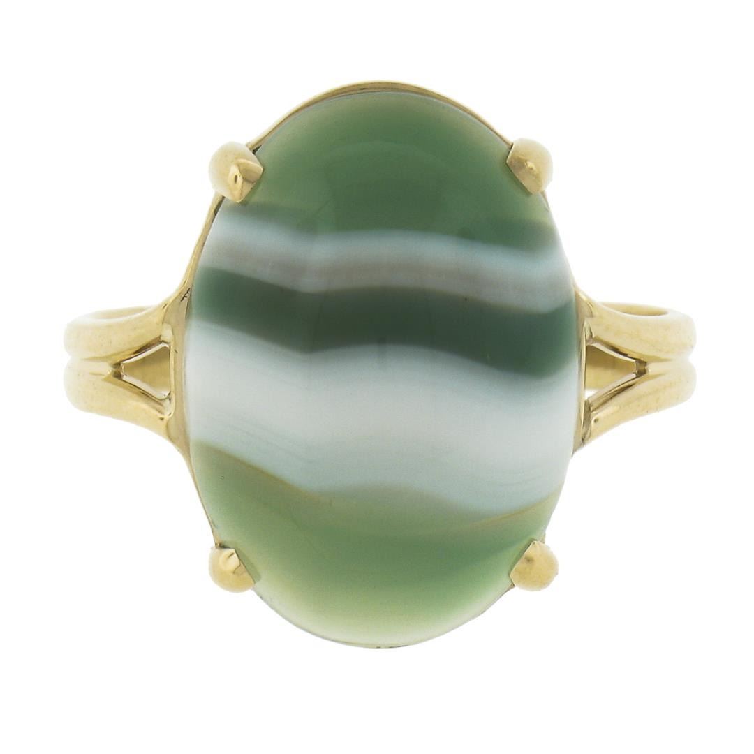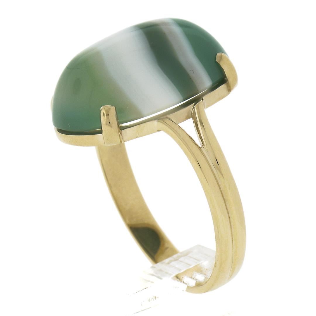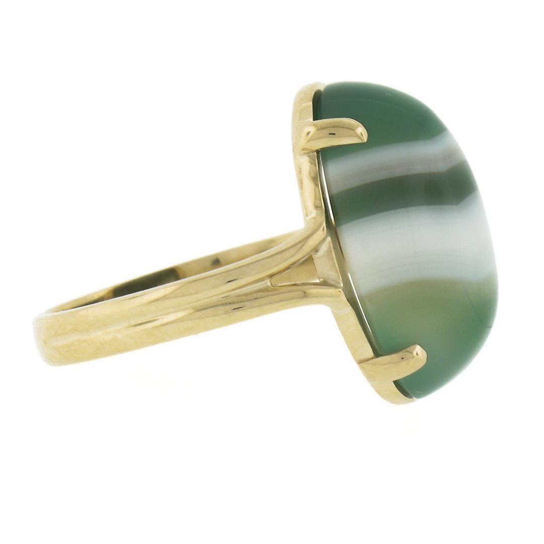 A new solid 14k yellow gold ring, with 1 oval cabochon cut natural agate (18.2x13mm). The ring is size 8.0, weighs a total of 5.33 grams, and measures 18.6mm wide.