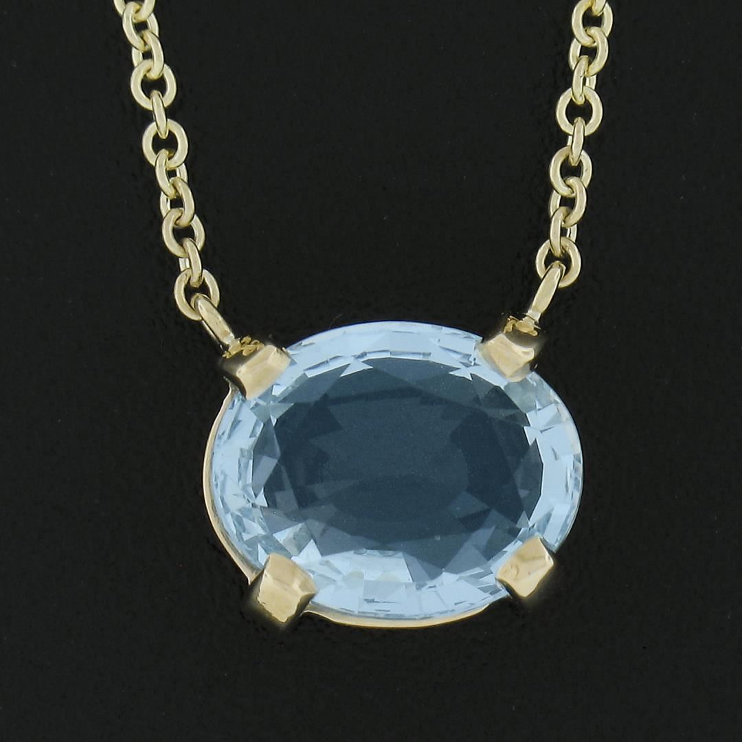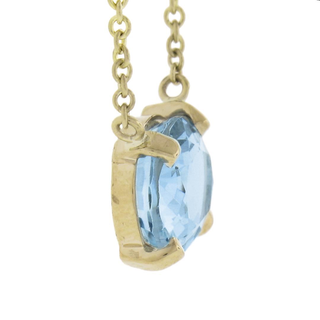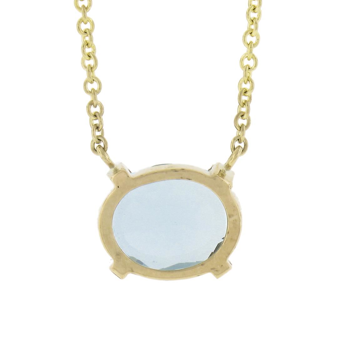 A new solid 14k yellow gold pendant necklace, with 1 oval cut natural aquamarine (2.46ct). 16 or 18 inch cable link chain, 3.34 grams total weight, pendant measures 8.3x10.3mm.