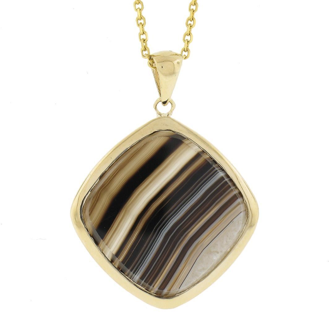 A new solid 14k yellow gold pendant nekclace, with 1 square cut natrual agate (17.7x17.6mm). adjustable 16 or 18 inch cable link chain, 5.65 grams total weight, pendant measures 28.3x20.9mm.